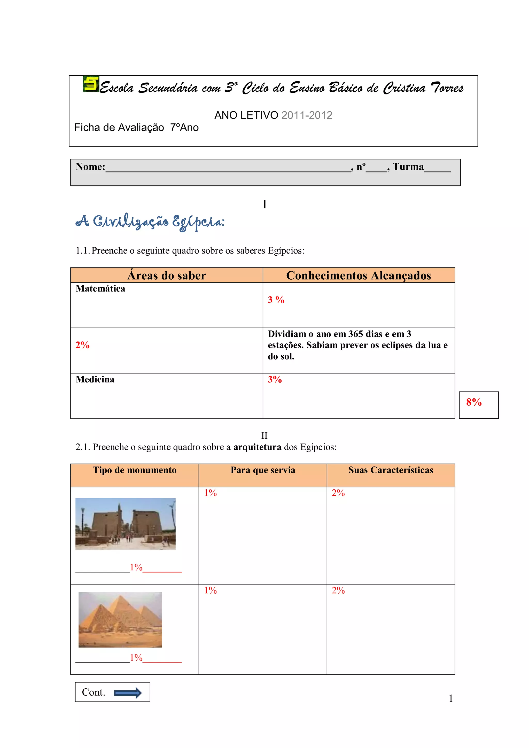1) O documento é uma ficha de avaliação sobre a civilização egípcia, grega e outras civilizações antigas do Mediterrâneo para alunos do 7o ano.
