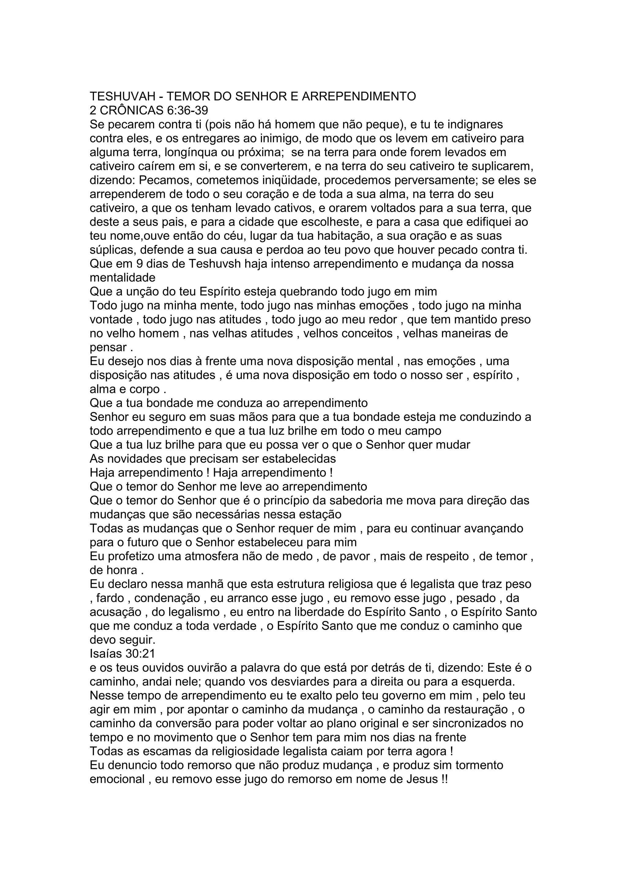 O documento discute o arrependimento e o temor do Senhor. Ele descreve como o povo de Deus deve se arrepender de todo o coração e alma quando são levados ao cativeiro por seus pecados. Também pede para que o Espírito Santo quebre todo jugo e leve a uma nova disposição mental, emocional e de atitudes, conduzindo ao verdadeiro arrependimento governado pelo Espírito.