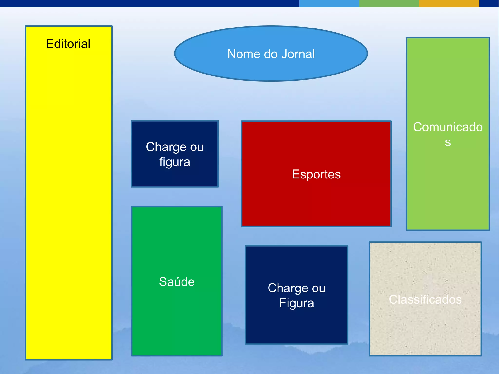 As seções principais de um jornal incluem o nome do jornal, editoriais, esportes, saúde e classificados.