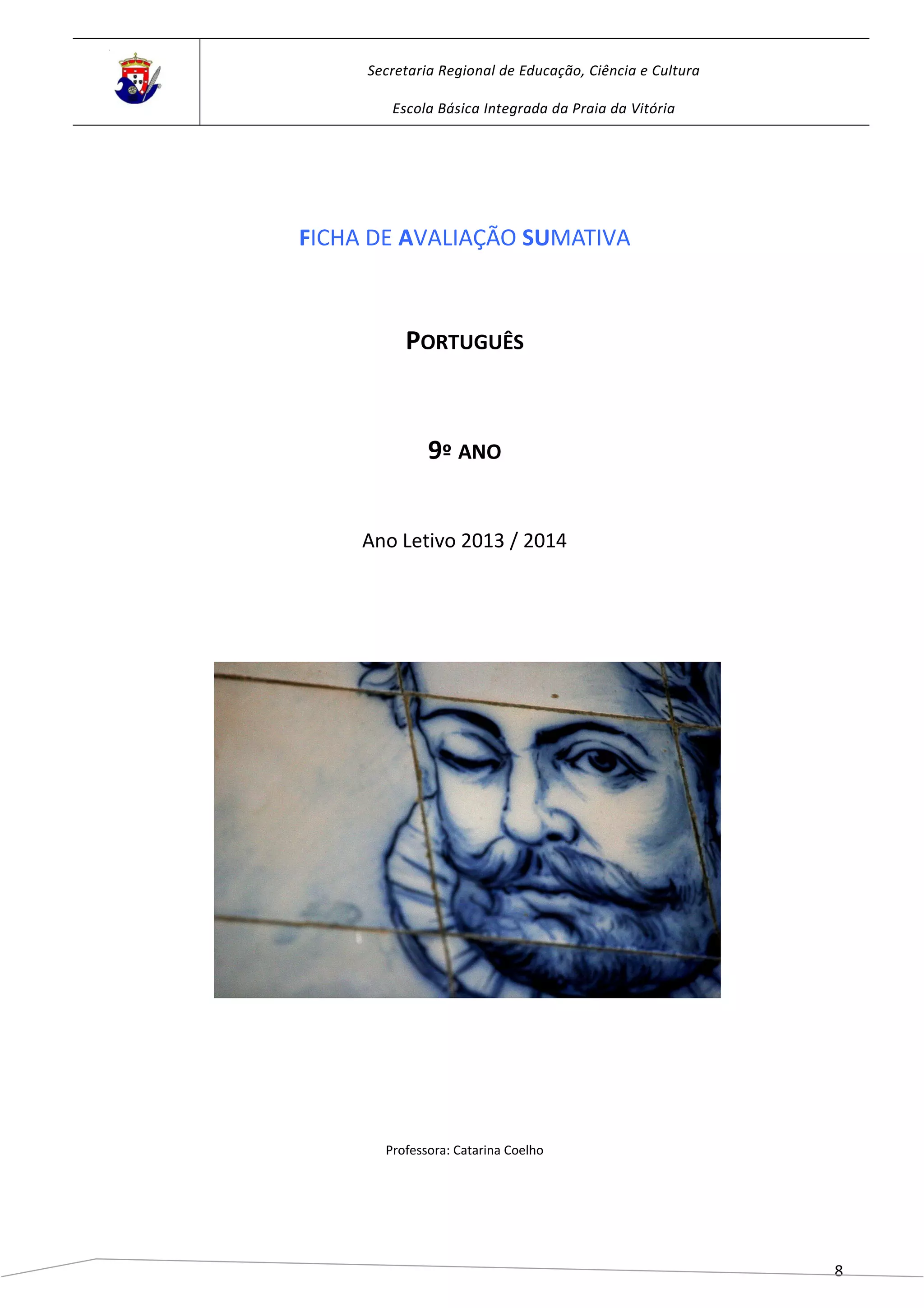 Este documento apresenta uma avaliação sumativa de Português para o 9o ano, dividida em quatro grupos. O Grupo I avalia a compreensão oral através de perguntas sobre um podcast. O Grupo II avalia a compreensão escrita com perguntas sobre um texto e versos de Camões. O Grupo III avalia a gramática com exercícios sobre verbos, pronomes e outros tópicos. O Grupo IV propõe a escolha entre dois temas para a expressão escrita.