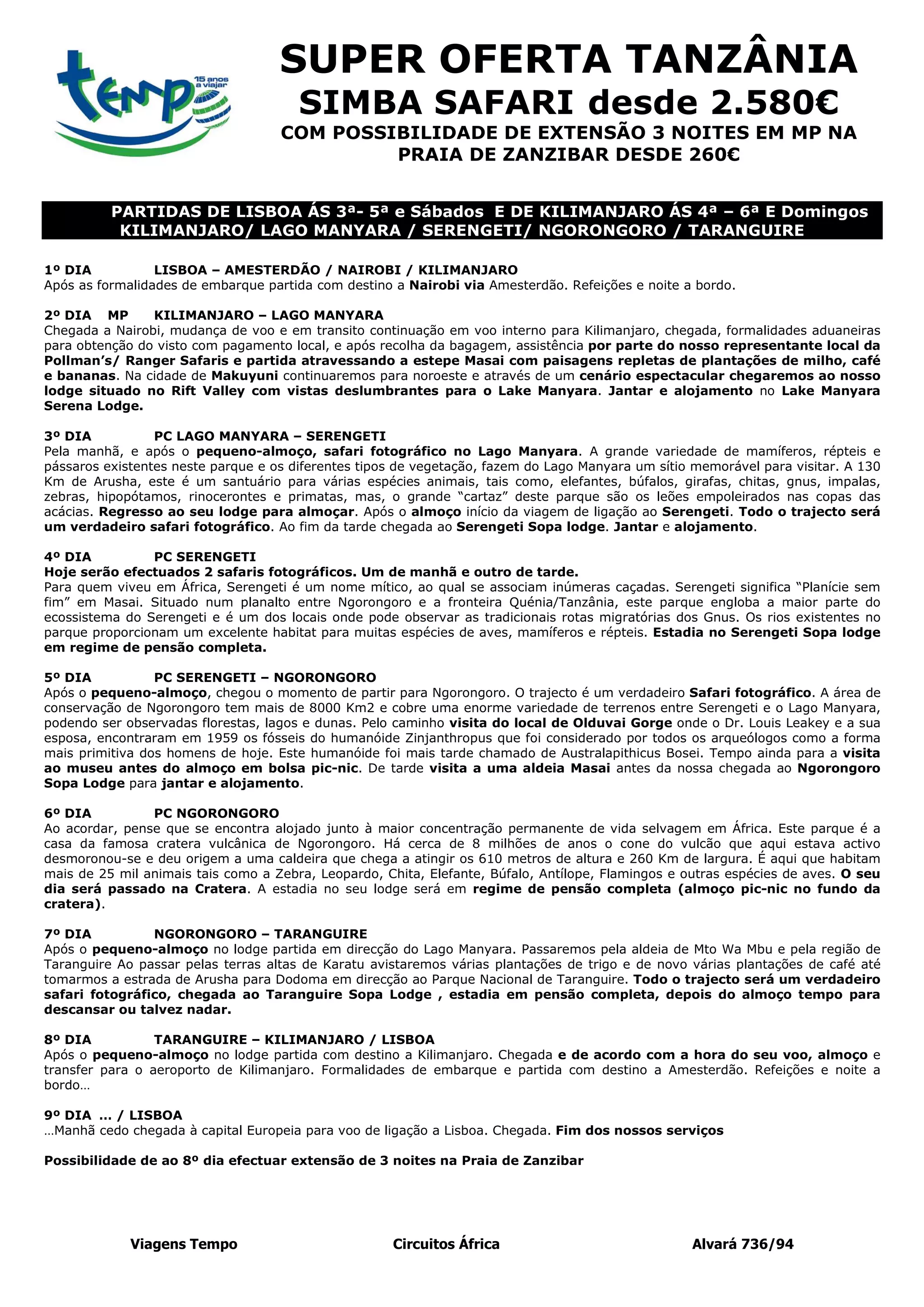 Este documento descreve uma viagem de safari de 9 dias pela Tanzânia, incluindo visitas ao Kilimanjaro, Lago Manyara, Serengeti, Ngorongoro e Taranguire, com a possibilidade de uma extensão de 3 noites em Zanzibar. O pacote inclui transporte, guias, alojamento em lodge e refeições. Os preços variam de 2.580€ a 3.150€ dependendo da época.