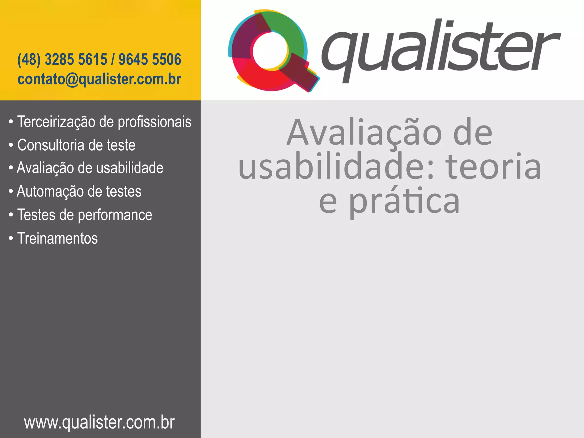 O documento fornece informações sobre os serviços oferecidos pela empresa Qualister, especializada em testes e qualidade de software. A Qualister oferece terceirização de profissionais de teste, consultoria, avaliação de usabilidade, automação de testes, testes de performance e treinamentos. O documento também fornece detalhes sobre cursos de avaliação de usabilidade ministrados pela Qualister.