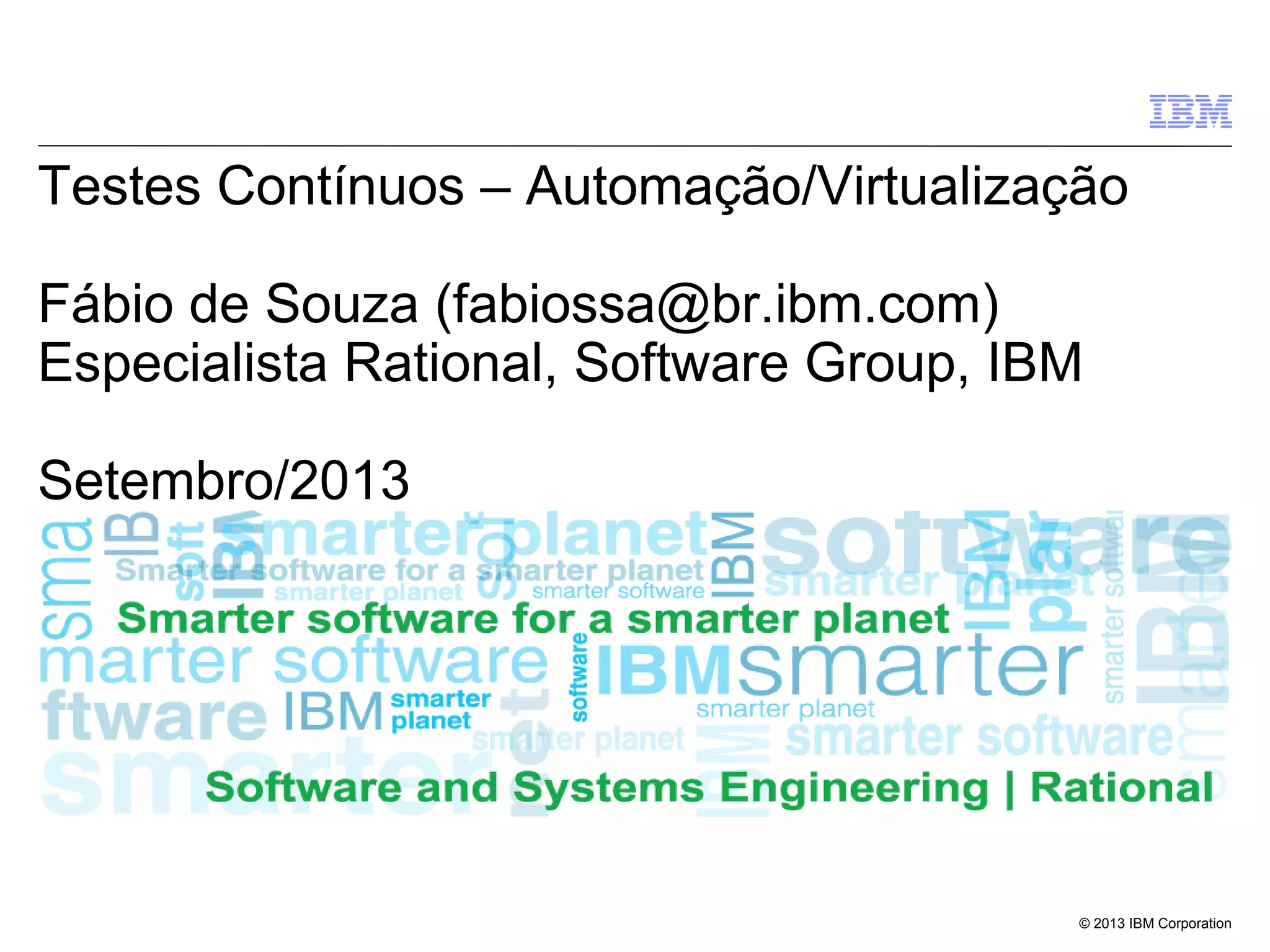 1) O documento discute como garantir melhor qualidade de software através da evolução de testes para gerenciamento inteligente da qualidade, apresentando a solução IBM Rational de virtualização em testes.