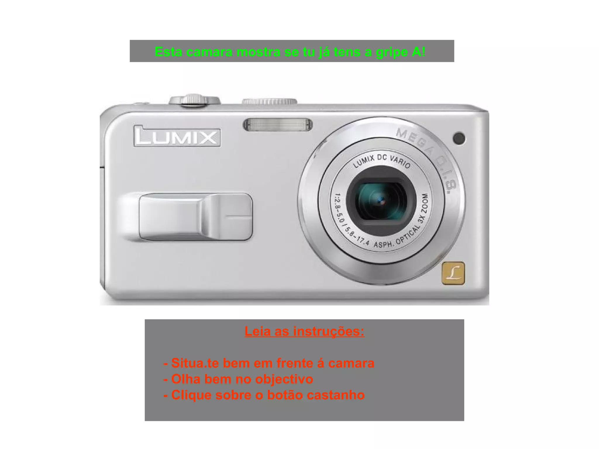 As instruções orientam o usuário a posicionar-se diante da câmera e olhar para o objetivo para tirar uma foto que analisará se ele tem gripe A. Após a foto, o resultado mostra que a foto foi bem-sucedida em 100% e recomenda tomar a vacina contra a gripe A.