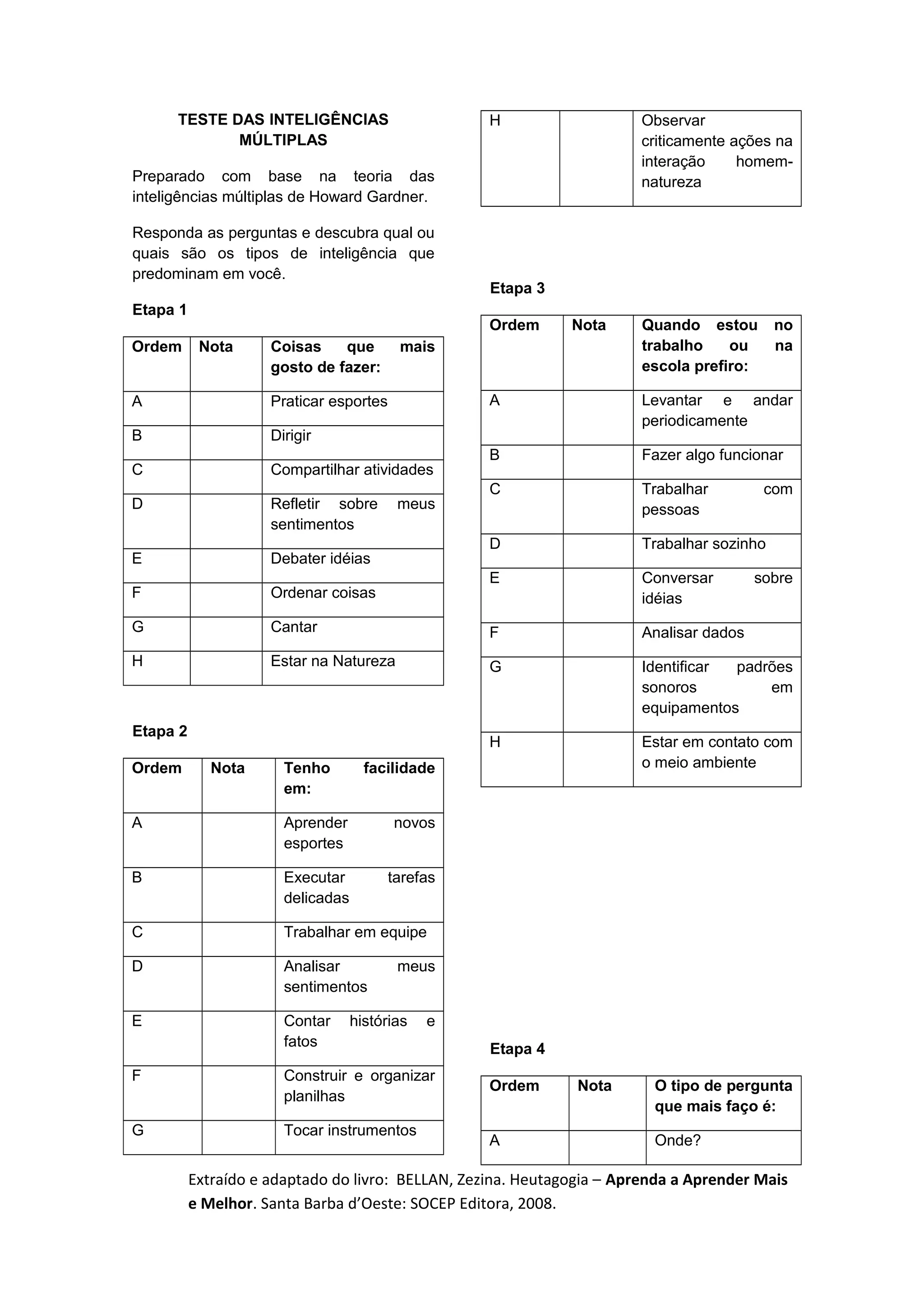 1) O documento apresenta um teste de inteligências múltiplas com 8 etapas que avaliam preferências e habilidades em diferentes áreas;