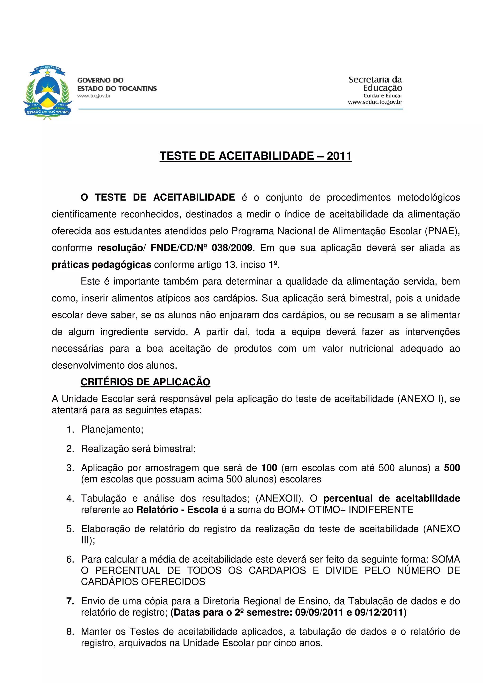 O documento fornece diretrizes sobre a aplicação de testes de aceitabilidade da alimentação escolar oferecida no Programa Nacional de Alimentação Escolar. As escolas devem aplicar os testes bimestralmente em amostras de estudantes para avaliar a qualidade dos alimentos e identificar possíveis problemas, a fim de melhorar os cardápios oferecidos. Anexos fornecem modelos para realizar os testes e registrar os resultados.