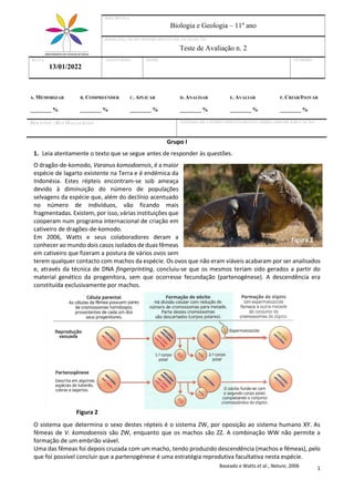 1) O documento descreve um estudo sobre a reprodução assexuada (partenogénese) observada em fêmeas de dragão-de-komodo em cativeiro.