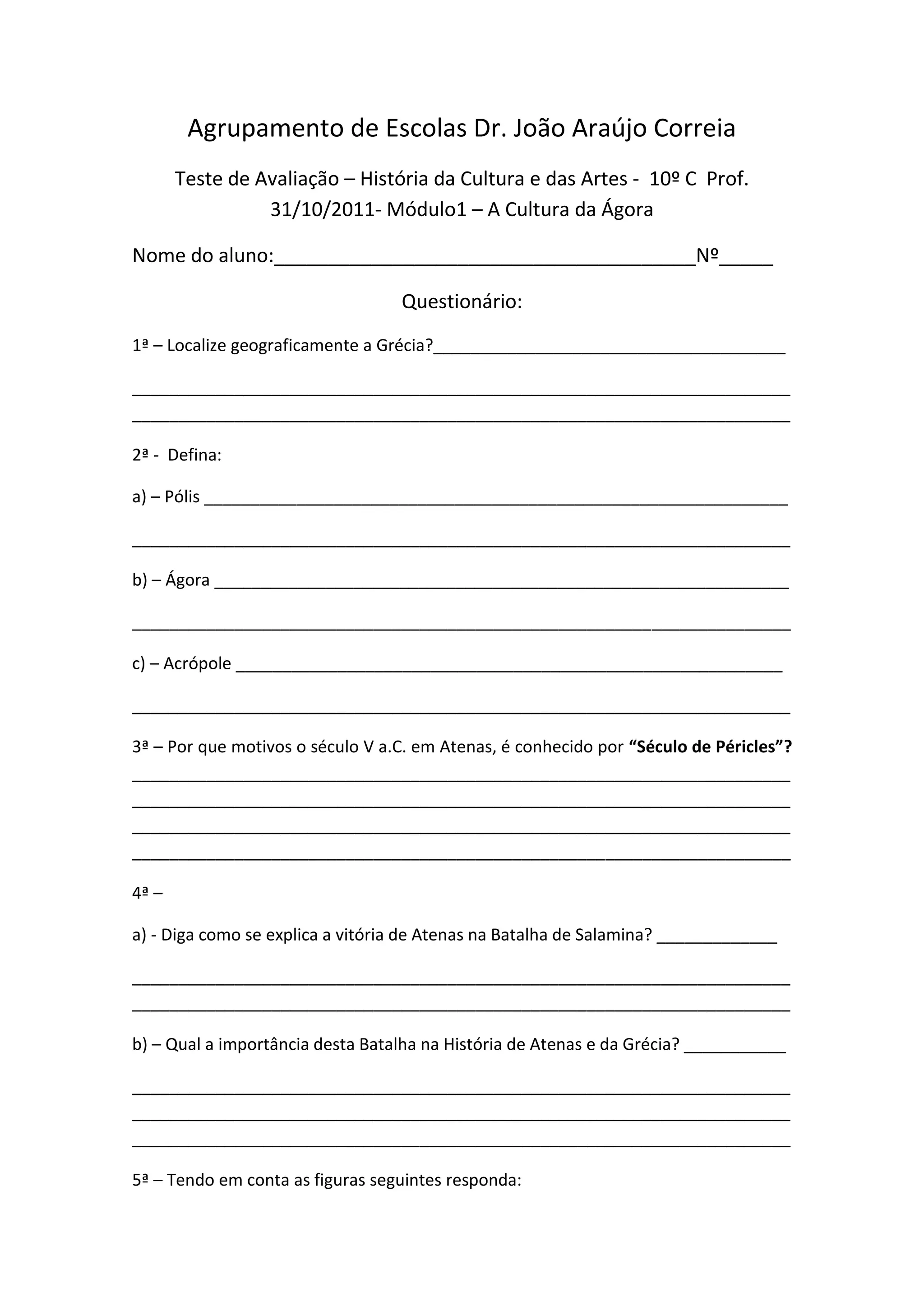 Este teste avalia o conhecimento de estudantes sobre a cultura e arte da Grécia antiga, focando na cidade de Atenas. As perguntas cobrem tópicos como a localização da Grécia, características da pólis, ágora e acrópole, a importância do século V a.C. em Atenas, batalhas históricas como Salamina, períodos artísticos, ordens arquitetônicas, deuses gregos e aspectos da filosofia, teatro e jogos na Grécia antiga.