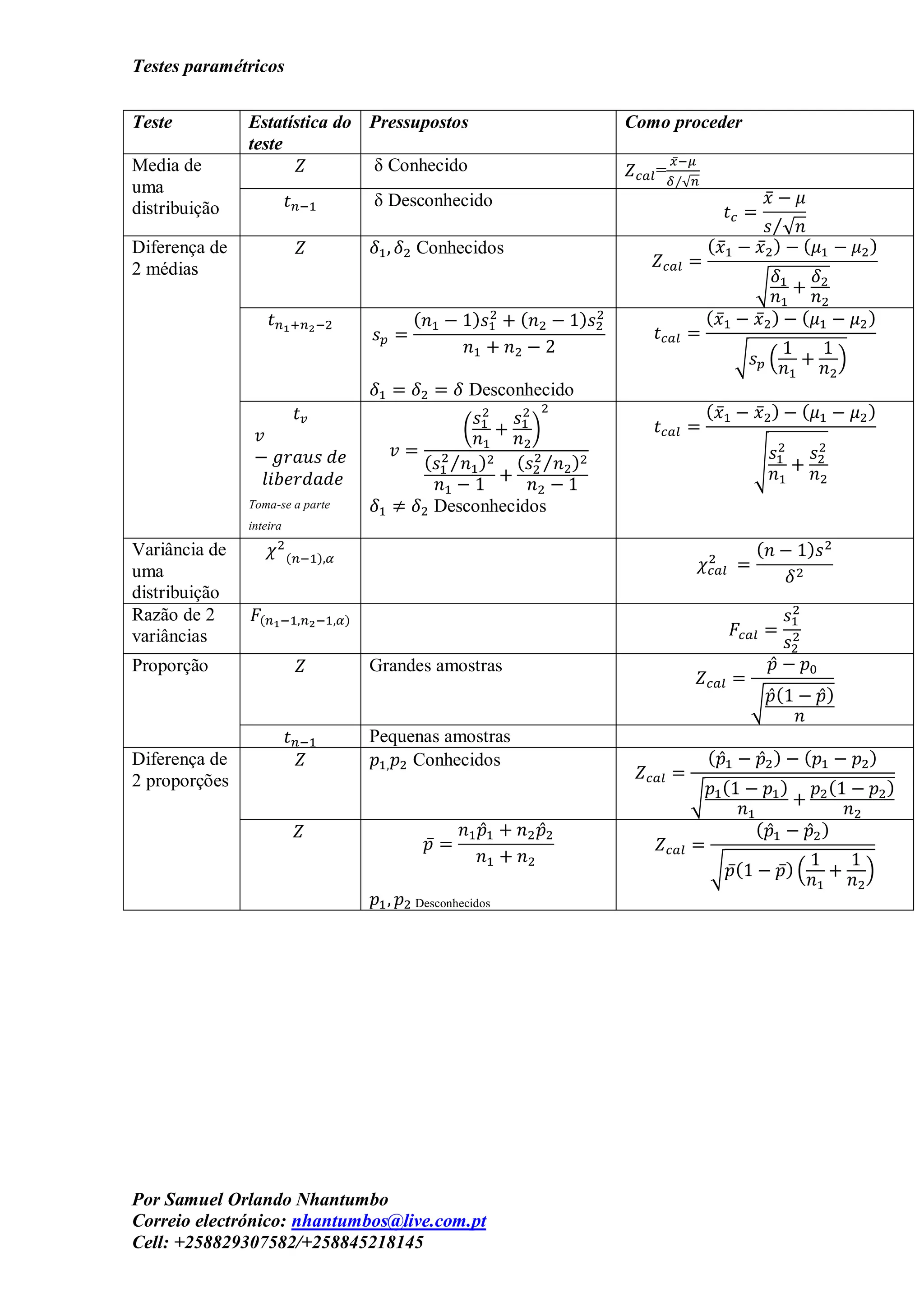 Este documento descreve testes paramétricos e não paramétricos. Para testes paramétricos, ele lista exemplos como a média de uma distribuição, a diferença entre duas médias, e a razão entre duas variâncias. Para testes não paramétricos, ele lista exemplos como o teste qui-quadrado, o teste de Kolmogorov-Smirnov, o teste de independência, e o teste de Lilliefors para a normalidade.