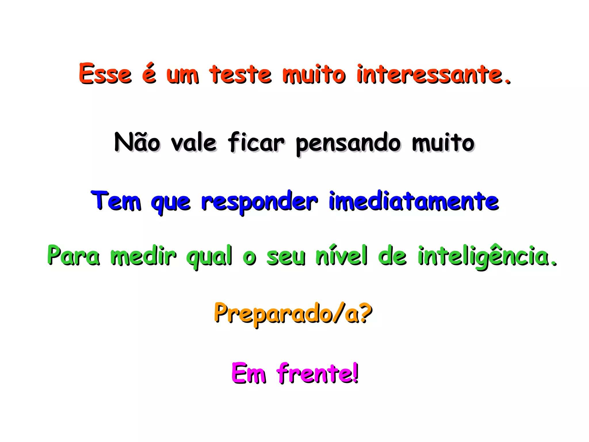 Este documento contém um teste de inteligência com perguntas de raciocínio lógico e aritmético, seguido de feedback para as respostas. A maioria das perguntas tem respostas óbvias, mas o texto sugere que o leitor tem dificuldade em responder corretamente e de forma rápida. No final, há um convite para se inscrever em uma lista de distribuição de mensagens motivacionais.