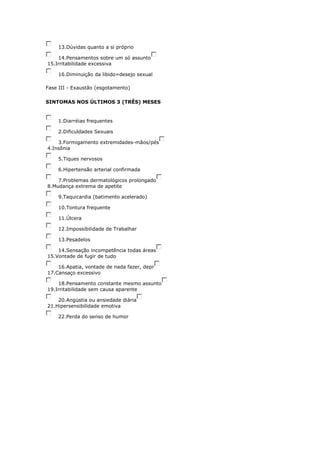 Este documento é um teste de sintomas de estresse dividido em três fases. A primeira fase lista sintomas de alerta agudo, a segunda lista sintomas de resistência no último mês, e a terceira lista sintomas de exaustão nos últimos três meses. O teste é usado para avaliar em qual fase o indivíduo se encontra de acordo com o número de sintomas experimentados, com 7 ou mais sintomas indicando a fase de alerta, 4 ou mais a fase intermediária, e 9 ou mais a fase crítica de exaustão.