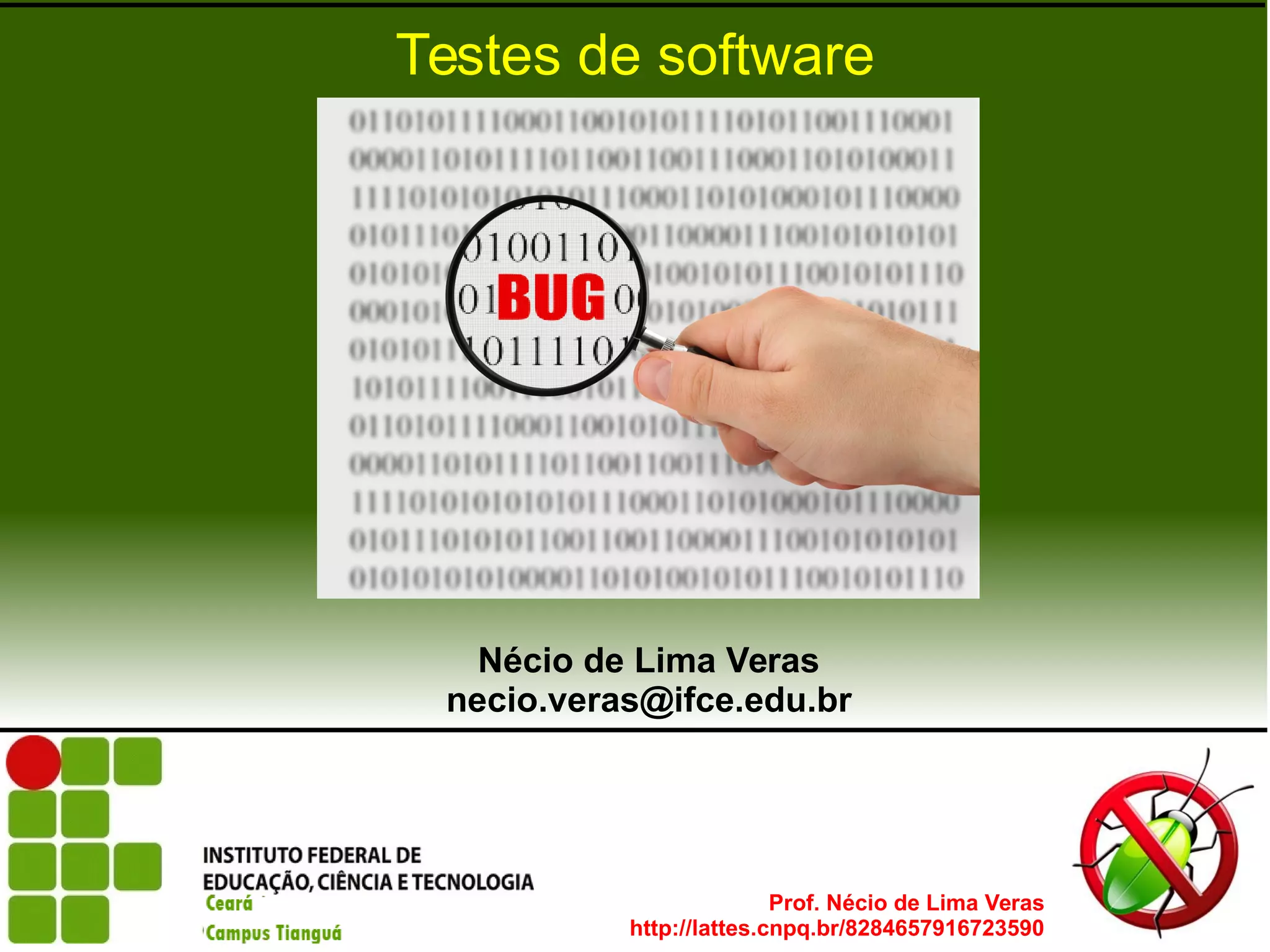 O documento discute testes de software, incluindo níveis de teste, modos de teste e abordagens como TDD (Desenvolvimento Dirigido por Testes) e BDD (Projeto Guiado por Comportamento). Ele fornece exemplos de como aplicar TDD e BDD, destacando a importância dos testes para medir a qualidade do software e reduzir falhas.