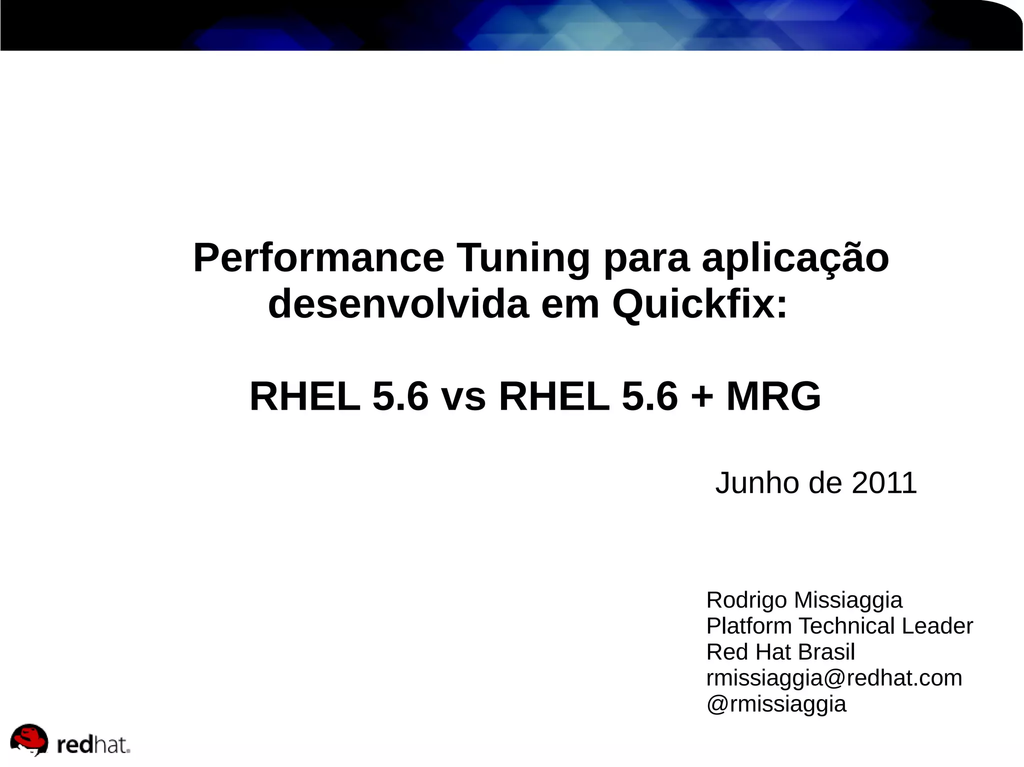 O documento descreve um teste de desempenho ("performance tuning") de uma aplicação desenvolvida em Quickfix rodando em RHEL 5.6 com e sem MRG. O teste mediu a latência e o tempo de execução de mais de 894.000 transações. Os resultados mostraram uma redução de 32% no tempo total de execução quando usando RHEL 5.6 com configurações de tuning e MRG, em comparação a apenas RHEL 5.6.