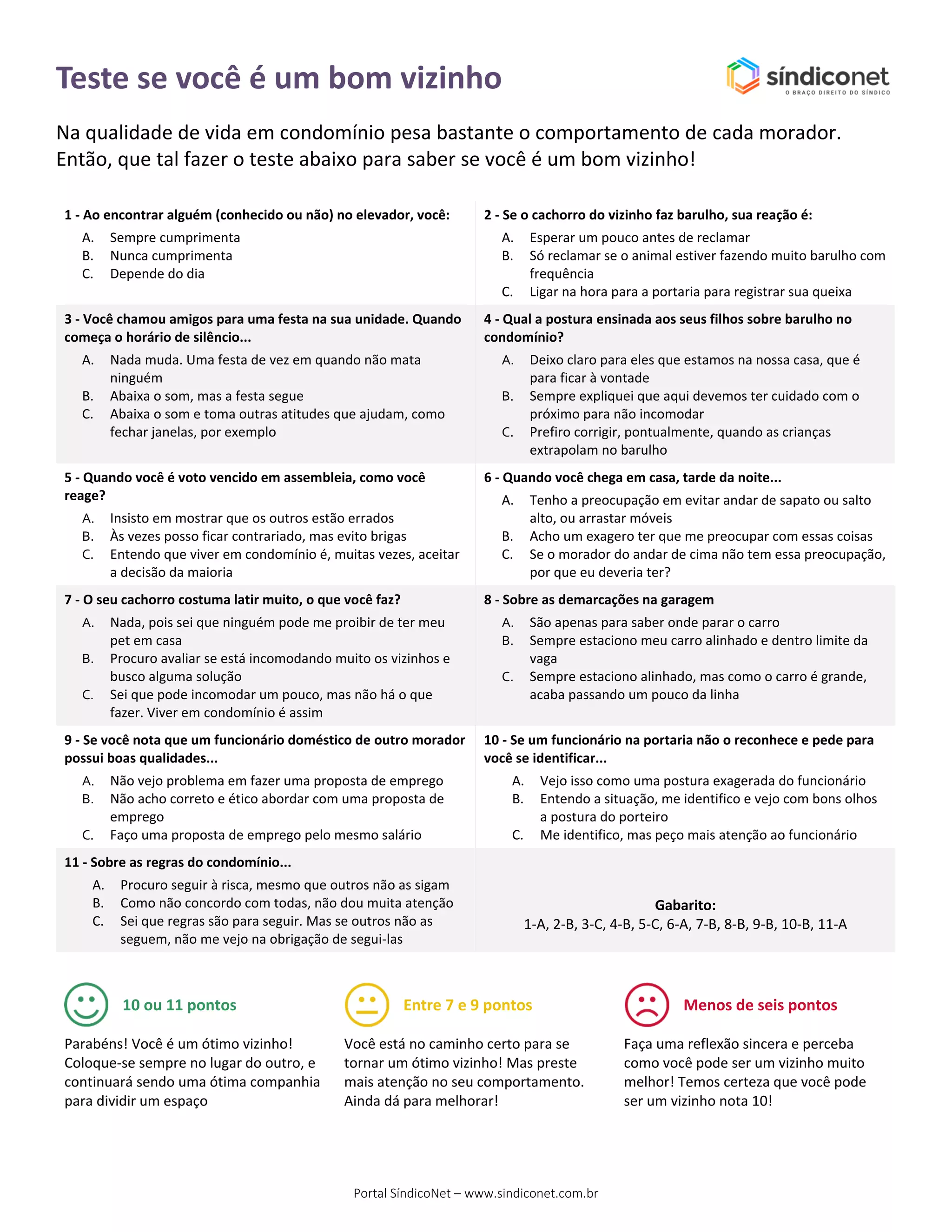 O documento apresenta um teste para avaliar se alguém é um bom vizinho em um condomínio, com questões sobre cumprimentar outros no elevador, reclamações sobre barulho de animais, comportamento durante festas e horário de silêncio, cuidados para não incomodar outros moradores à noite, e seguir as regras do condomínio. O teste é pontuado de 1 a 11 e oferece feedback se a pessoa é um ótimo, bom ou precisa melhorar como vizinho de acordo com as respostas.
