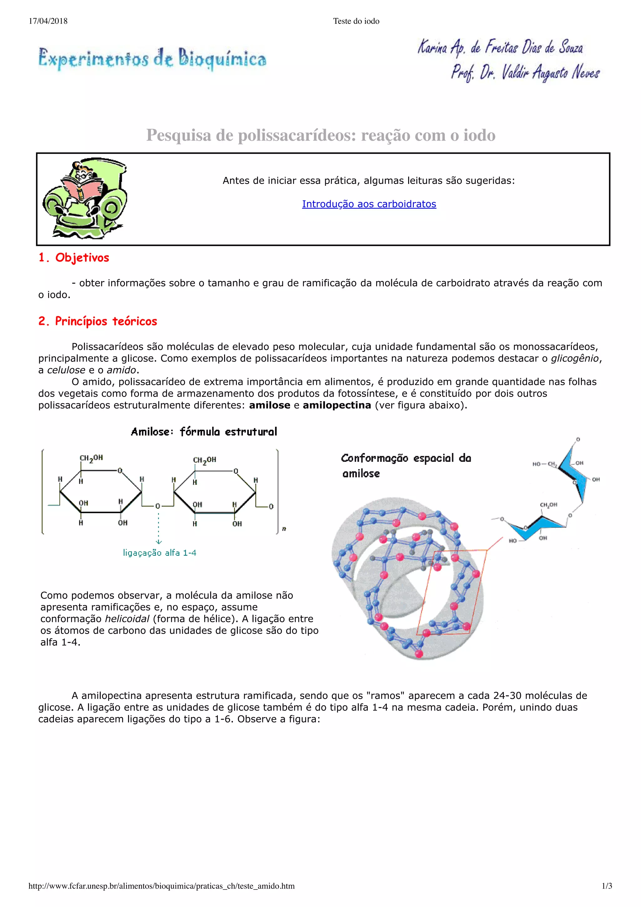 Este documento descreve um experimento para identificar amido através da reação com iodo. Explica que o amido é composto por amilose e amilopectina, e que a amilose forma um complexo azul com iodo enquanto a amilopectina forma um complexo vermelho-violáceo. O procedimento experimental envolve adicionar soluções de amido, glicose e água a tubos de ensaio e observando as cores desenvolvidas após adição de iodo.