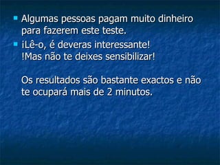 Este documento apresenta um teste de personalidade composto por 10 perguntas. As respostas são pontuadas e a pontuação total indica como outras pessoas podem ver a personalidade do participante, variando de tímido e indeciso para alguém excitante mas impulsivo. O documento instrui o leitor a enviar o teste a outros depois de completá-lo e colocar a sua pontuação no assunto do email.