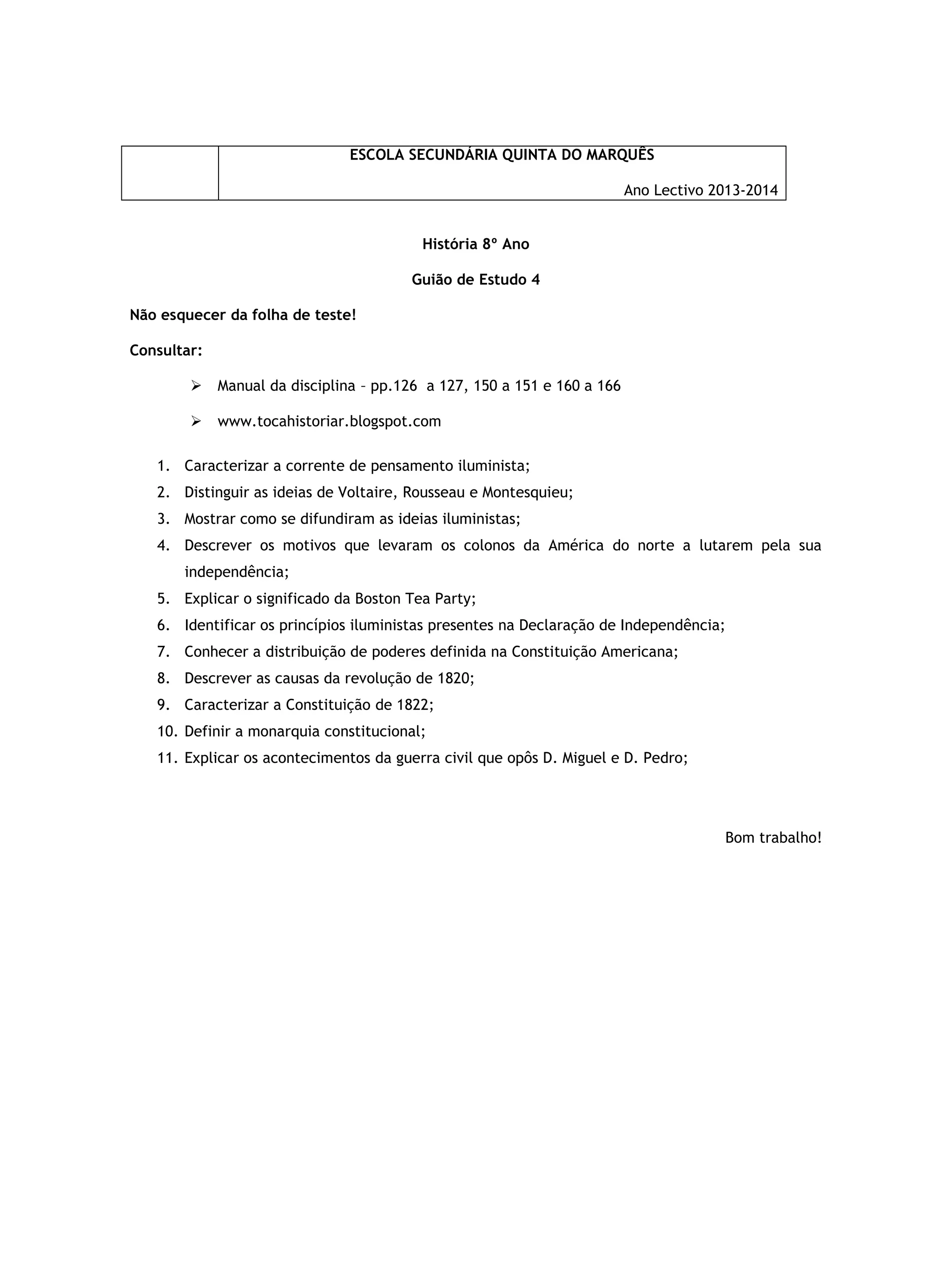 Este documento fornece um guia de estudo para uma prova de História do 8o ano sobre o Iluminismo e as Revoluções Liberais. Ele lista 11 objetivos de aprendizagem e direciona os alunos a consultar certas páginas do manual e um site para se prepararem.