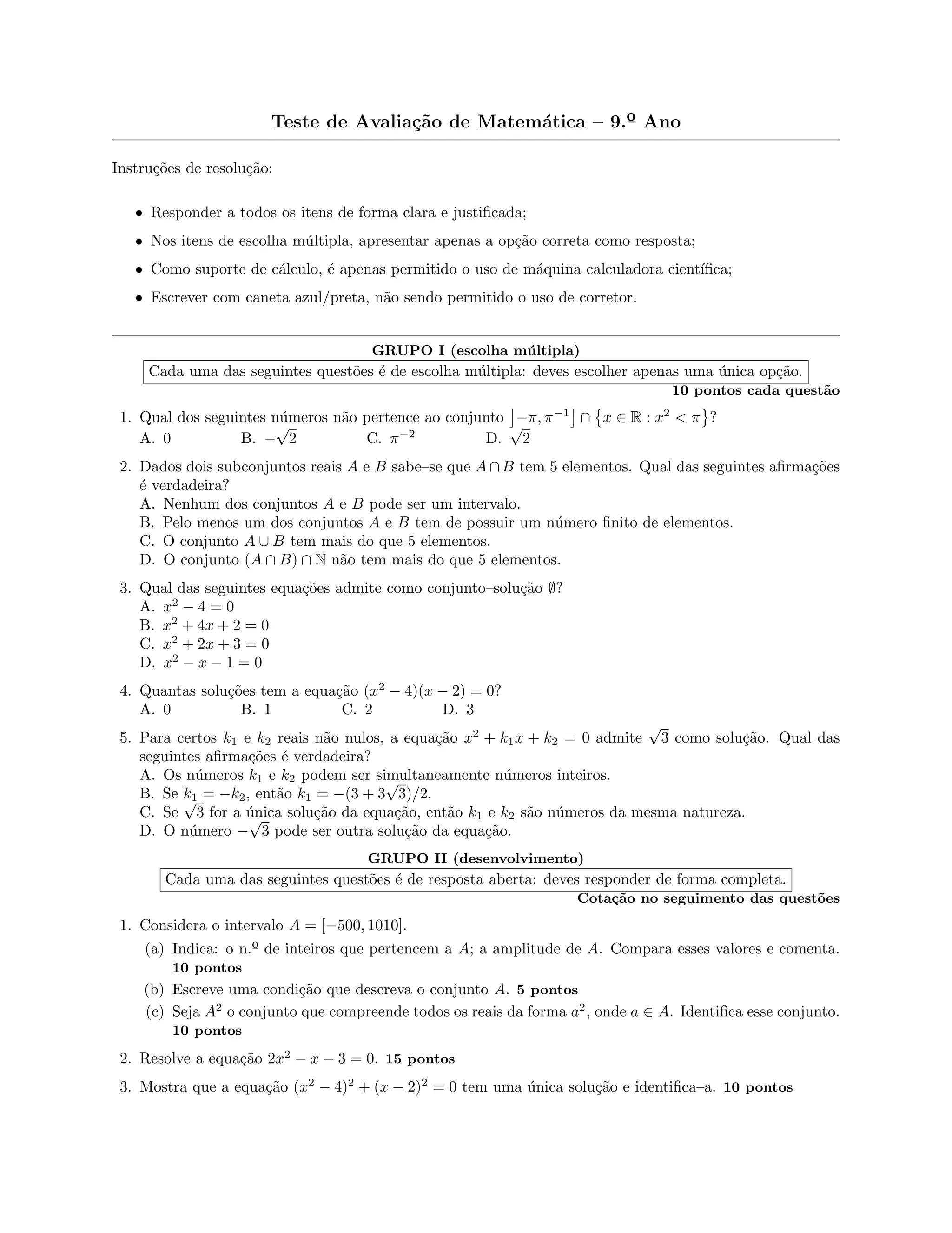 1. O documento apresenta um teste de matemática do 9o ano com instruções de resolução e 5 questões de escolha múltipla e 3 questões abertas.