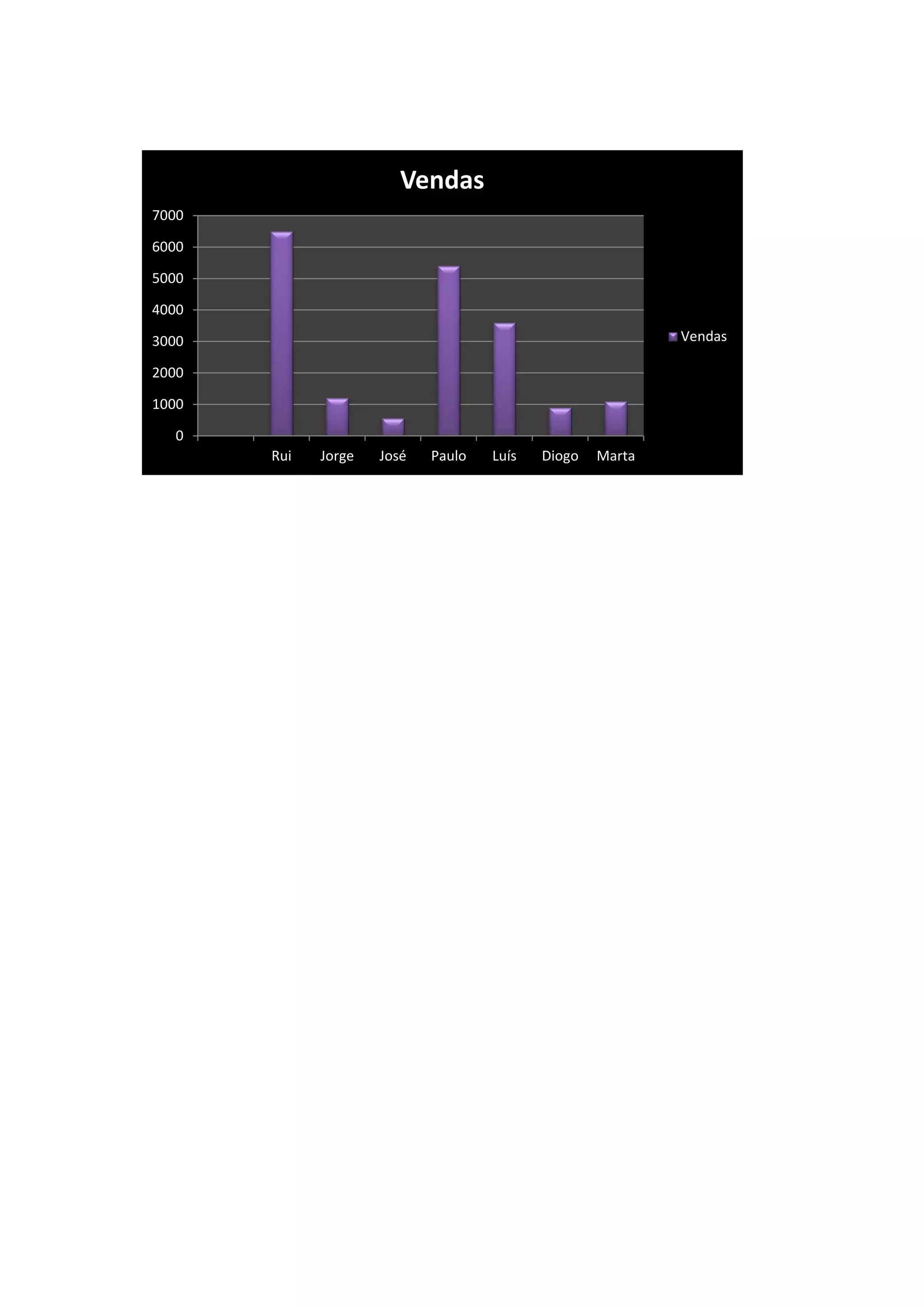 As vendas de seis vendedores são mostradas em gráfico de barras. Rui teve as maiores vendas, enquanto Marta teve as menores vendas. O gráfico mostra a performance de vendas de cada vendedor.