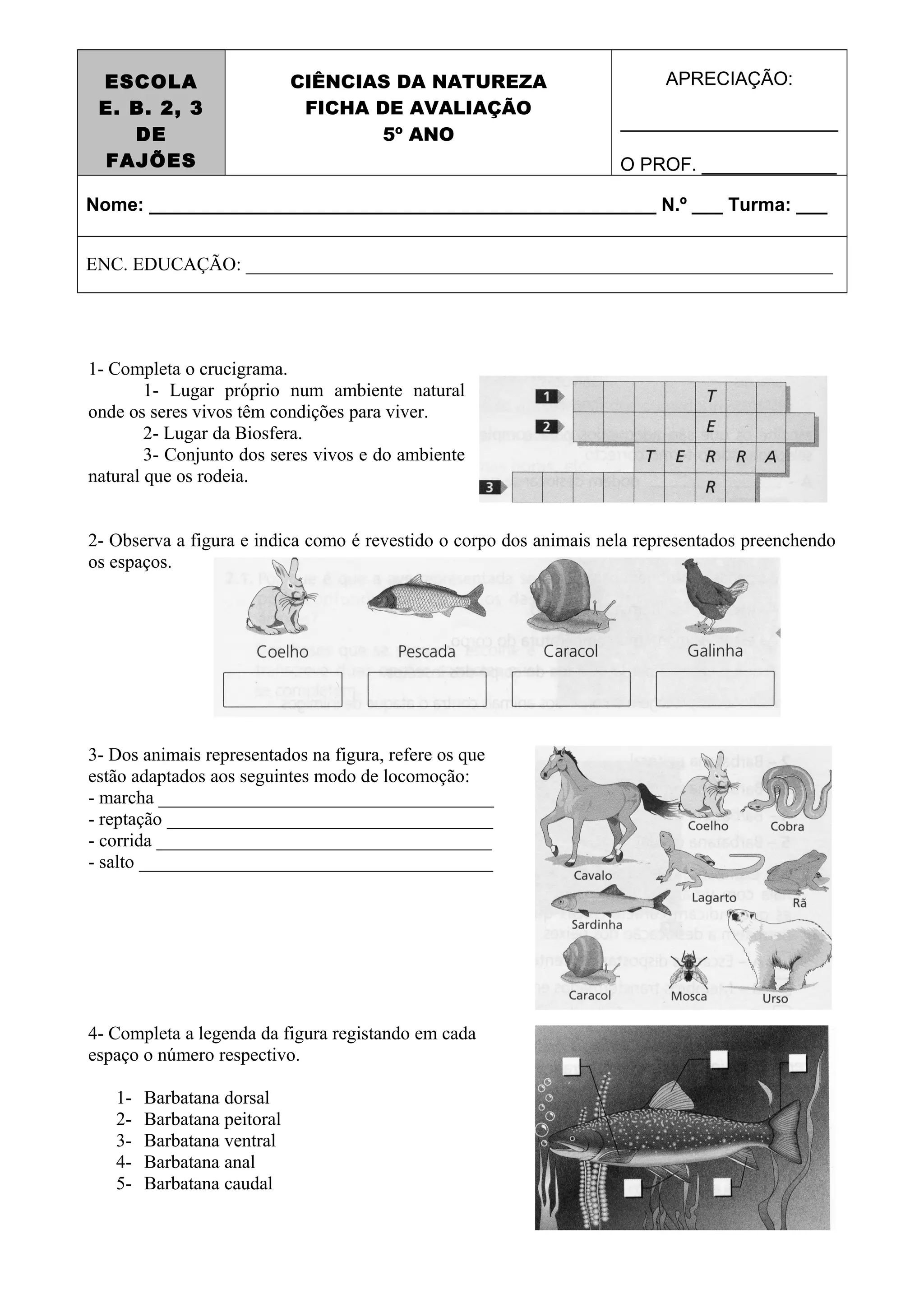O documento é uma ficha de avaliação de Ciências da Natureza para o 5o ano de escolaridade. A ficha inclui vários exercícios relacionados com os reinos dos seres vivos, características de animais, partes do corpo de animais e identificação de órgãos biológicos em figuras. Os alunos devem completar crucigramas, associar termos a figuras, e identificar características de diferentes grupos taxonómicos.