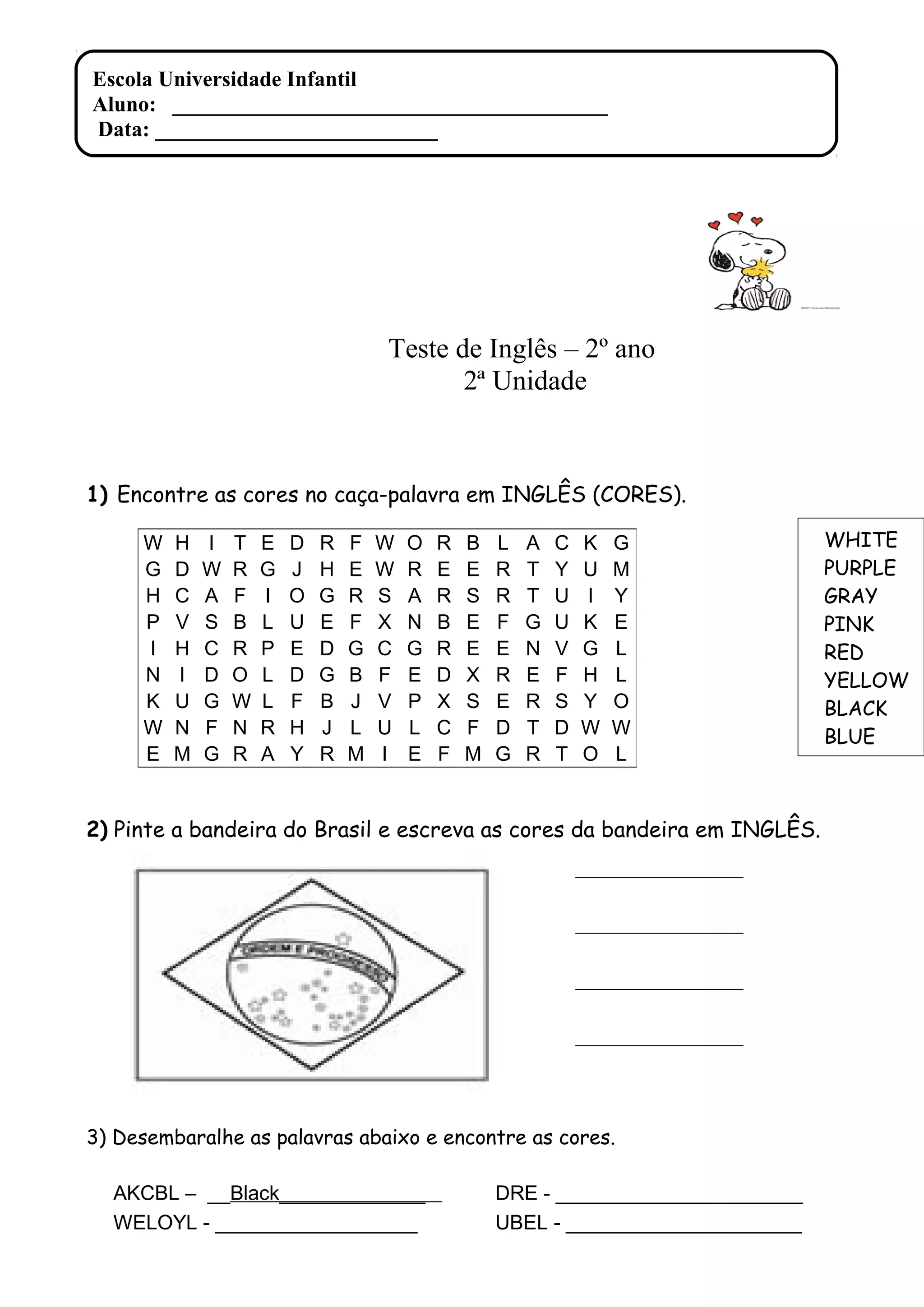 O documento é um teste de Inglês para alunos do 2o ano sobre cores. Ele inclui atividades como encontrar cores em um caça-palavras, pintar a bandeira do Brasil com as cores em Inglês, desmembrar palavras para revelar cores e traduzir cores do Inglês para Português.