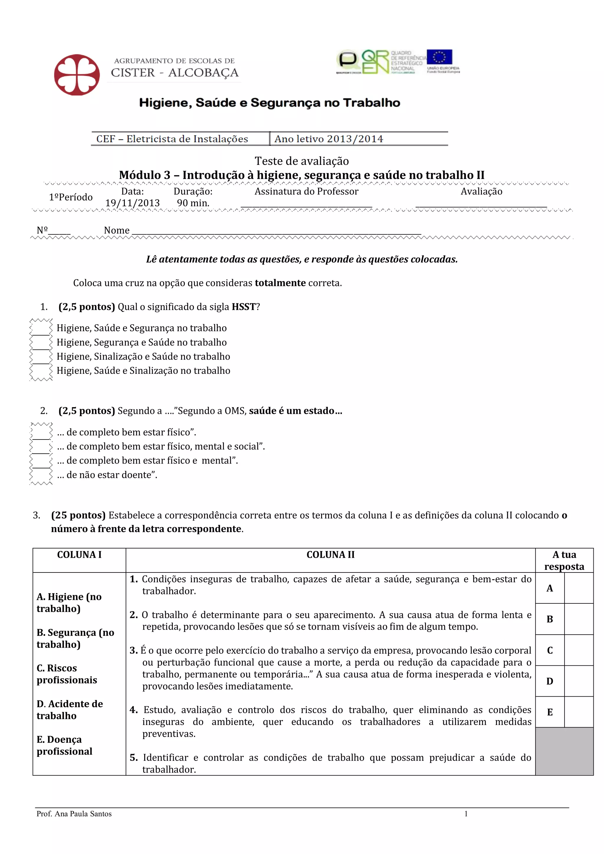 Este documento apresenta um teste de avaliação sobre higiene, segurança e saúde no trabalho com 7 questões. O teste aborda conceitos como acidentes de trabalho, doenças profissionais e riscos no trabalho. As questões examinam esses tópicos e também questões relacionadas a estatísticas sobre acidentes e setores com maiores riscos.