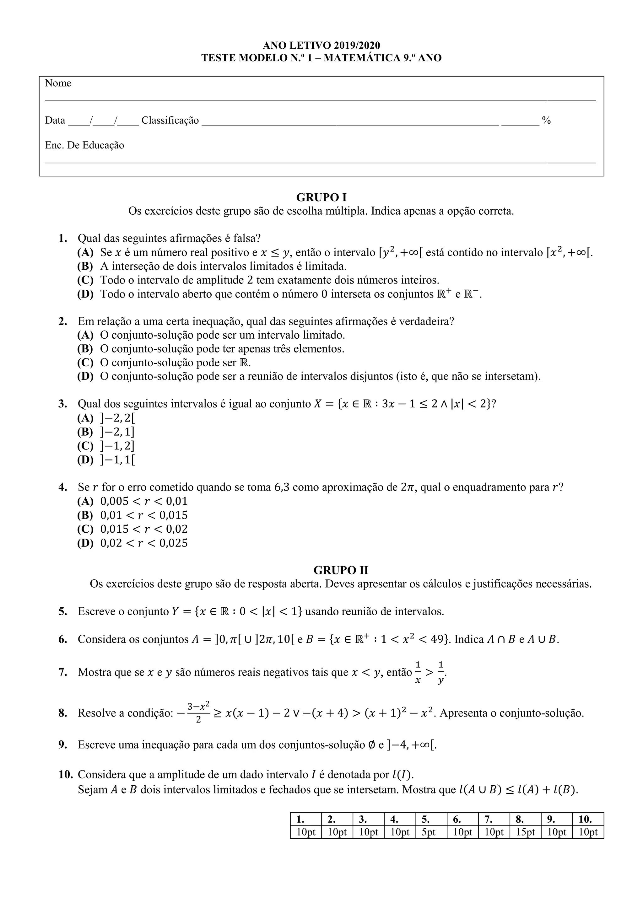 Este teste de matemática do 9o ano contém 10 questões sobre intervalos, inequações e aproximações. As questões 1-4 são de escolha múltipla sobre propriedades de intervalos e conjuntos-solução de inequações. As questões 5-10 requerem cálculos e justificações para expressar conjuntos usando intervalos, determinar interseções e uniões de conjuntos, provar desigualdades e propriedades de amplitude de intervalos.