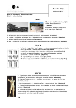 O documento contém 16 perguntas sobre arquitetura, escultura e pintura da Grécia Antiga, divididas em três grupos. As perguntas cobrem tópicos como arquitetos responsáveis por estádios, características de ordens arquitetônicas e períodos da arte grega, importância de figuras históricas como Péricles, e estilos de pintura em cerâmica grega.