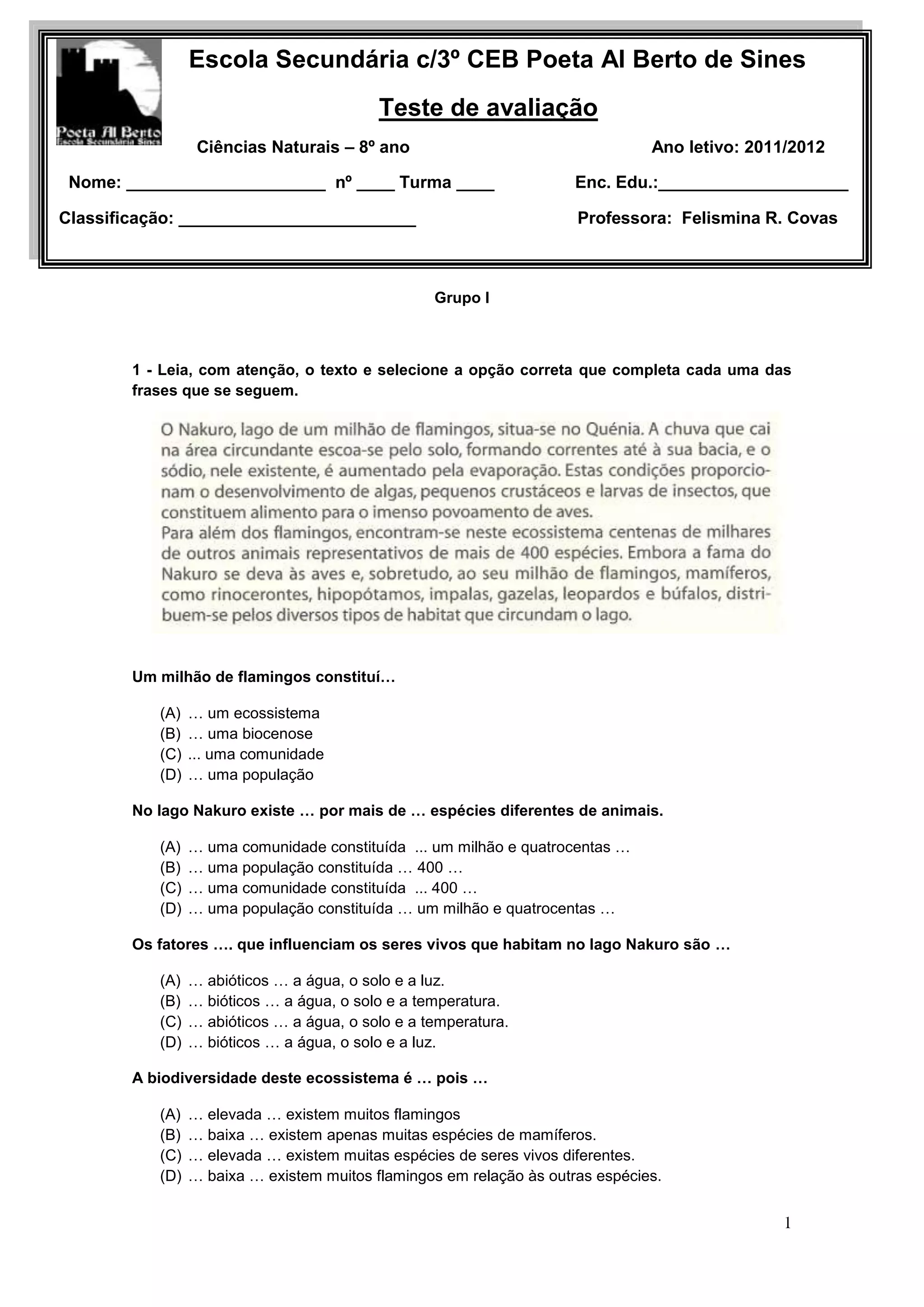 Este teste de avaliação em Ciências Naturais avalia os conceitos de ecossistema, bioma e adaptação de organismos a fatores ambientais. Os alunos devem responder a questões de escolha múltipla e de resposta aberta sobre comunidades biológicas, fatores abióticos, classificação de sistemas e distribuição de espécies em relação à temperatura.