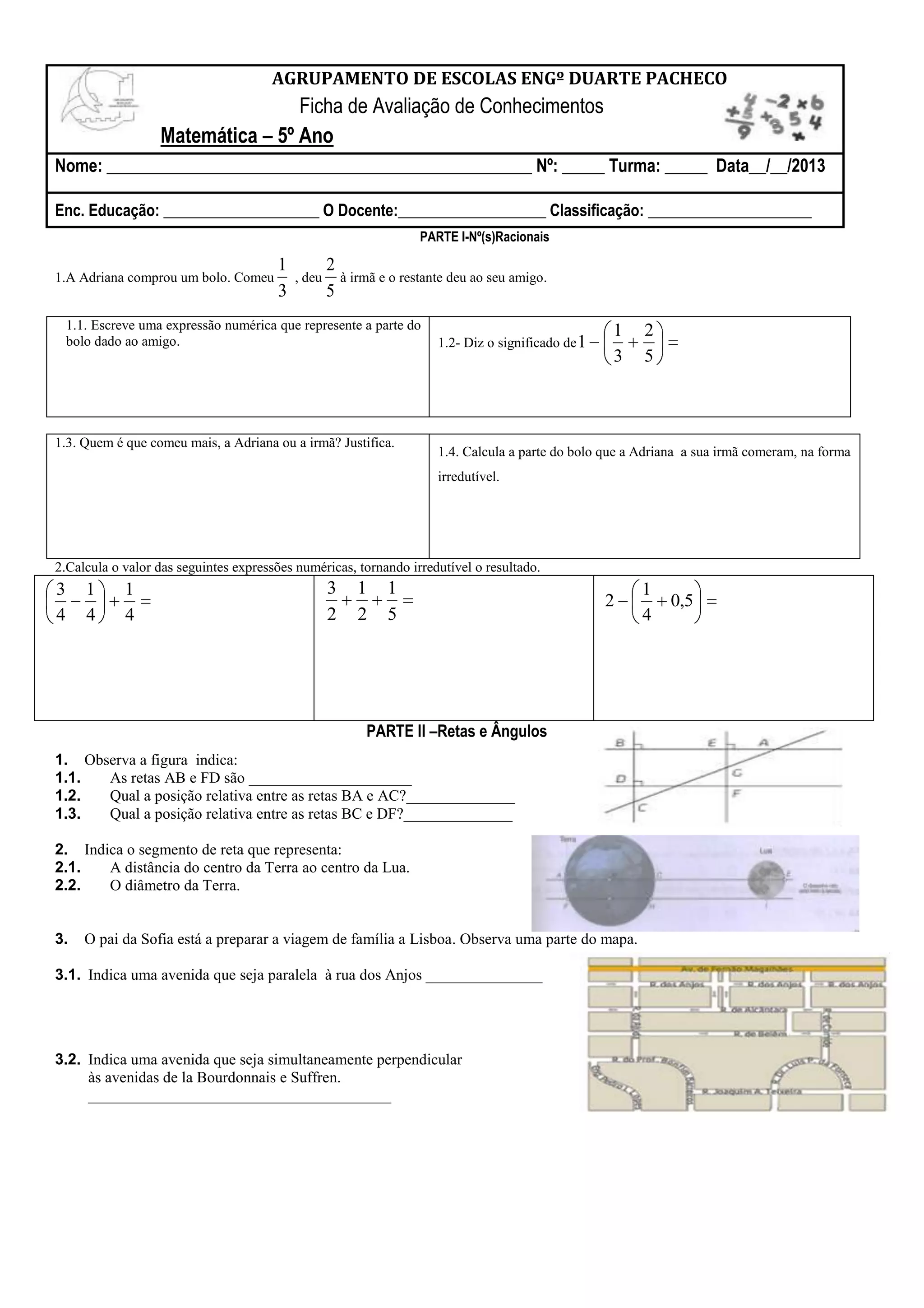 [1] O documento apresenta uma ficha de avaliação de conhecimentos de matemática para alunos do 5o ano com questões sobre números racionais, retas e ângulos. [2] As questões incluem cálculos com expressões numéricas, identificação de posições relativas entre retas, construção e medição de ângulos. [3] A ficha avalia conceitos matemáticos essenciais para alunos do 5o ano.