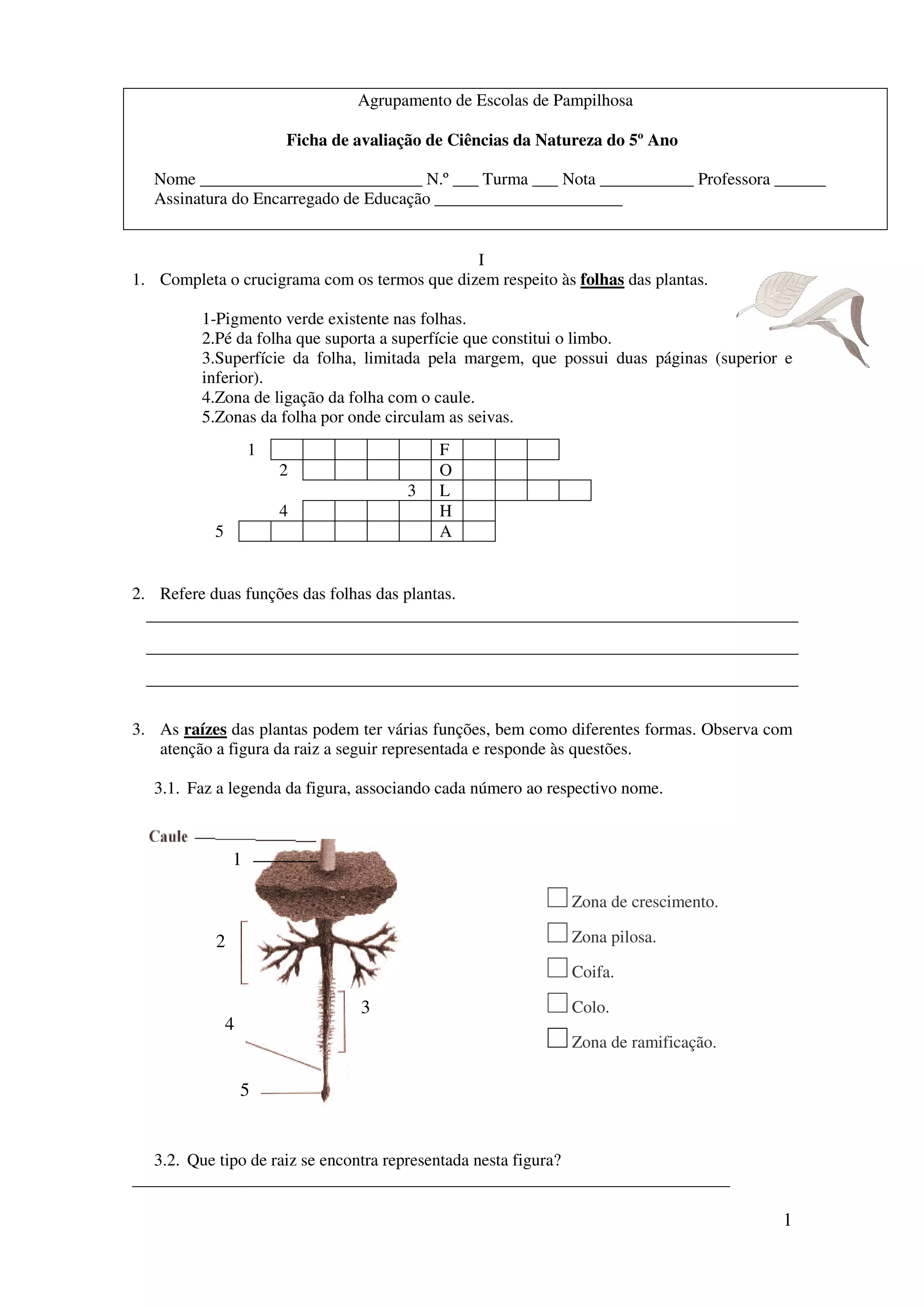 2. Os alunos devem identificar termos relacionados às folhas em um crucigrama e referir duas funções das folhas.