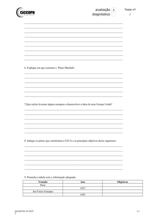 O documento discute a história e organização política de Portugal e da União Europeia. Inclui perguntas sobre os símbolos nacionais de Portugal, os órgãos de governo, a entrada de Portugal na UE, e a criação da moeda euro.