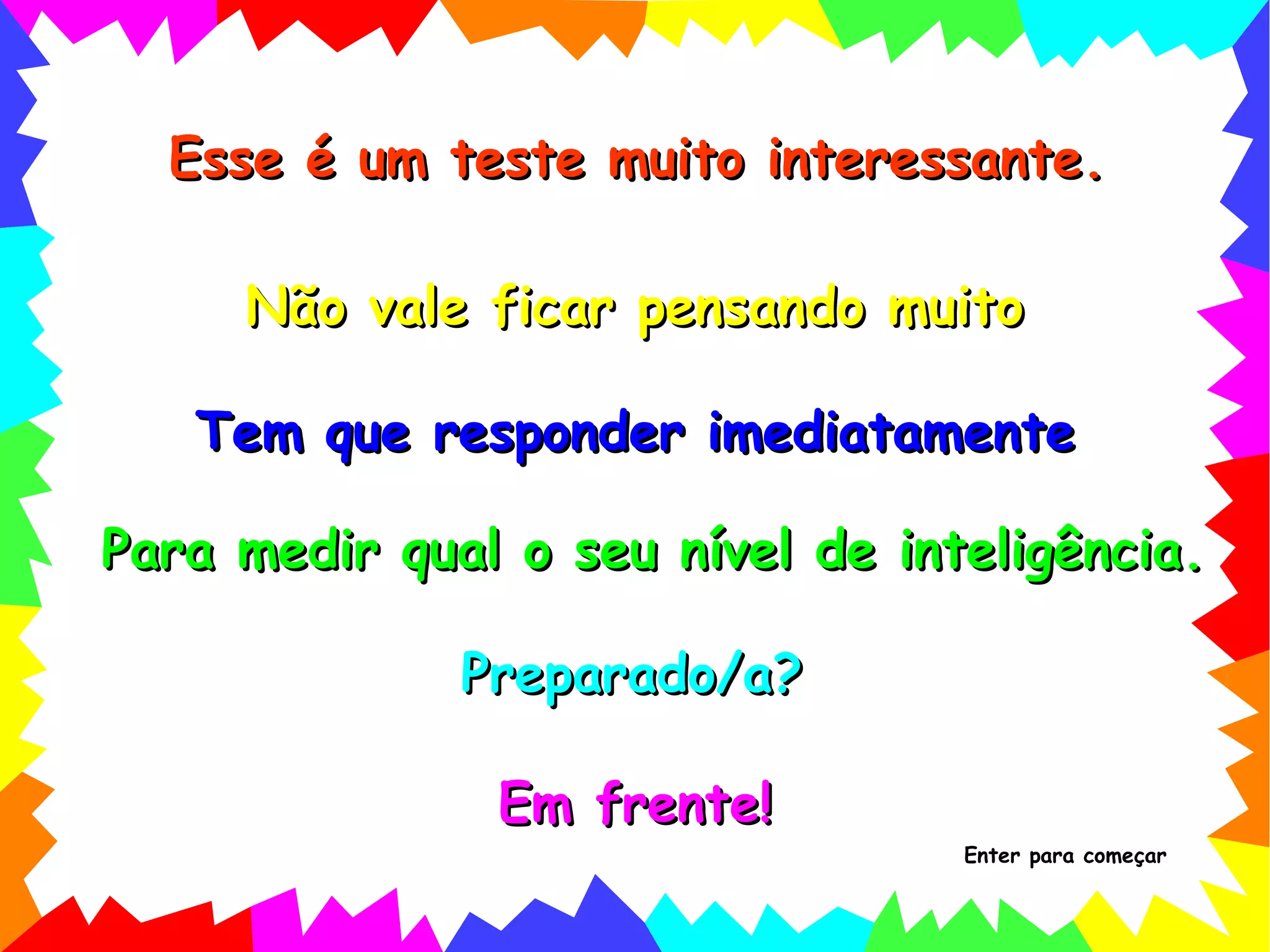 Esse é umteste muito interessante. Não vale ficar pensando muito Para medir qual o seu nível de inteligência. Preparado/a? Em frente! Tem que responder imediatamente Enter para começar