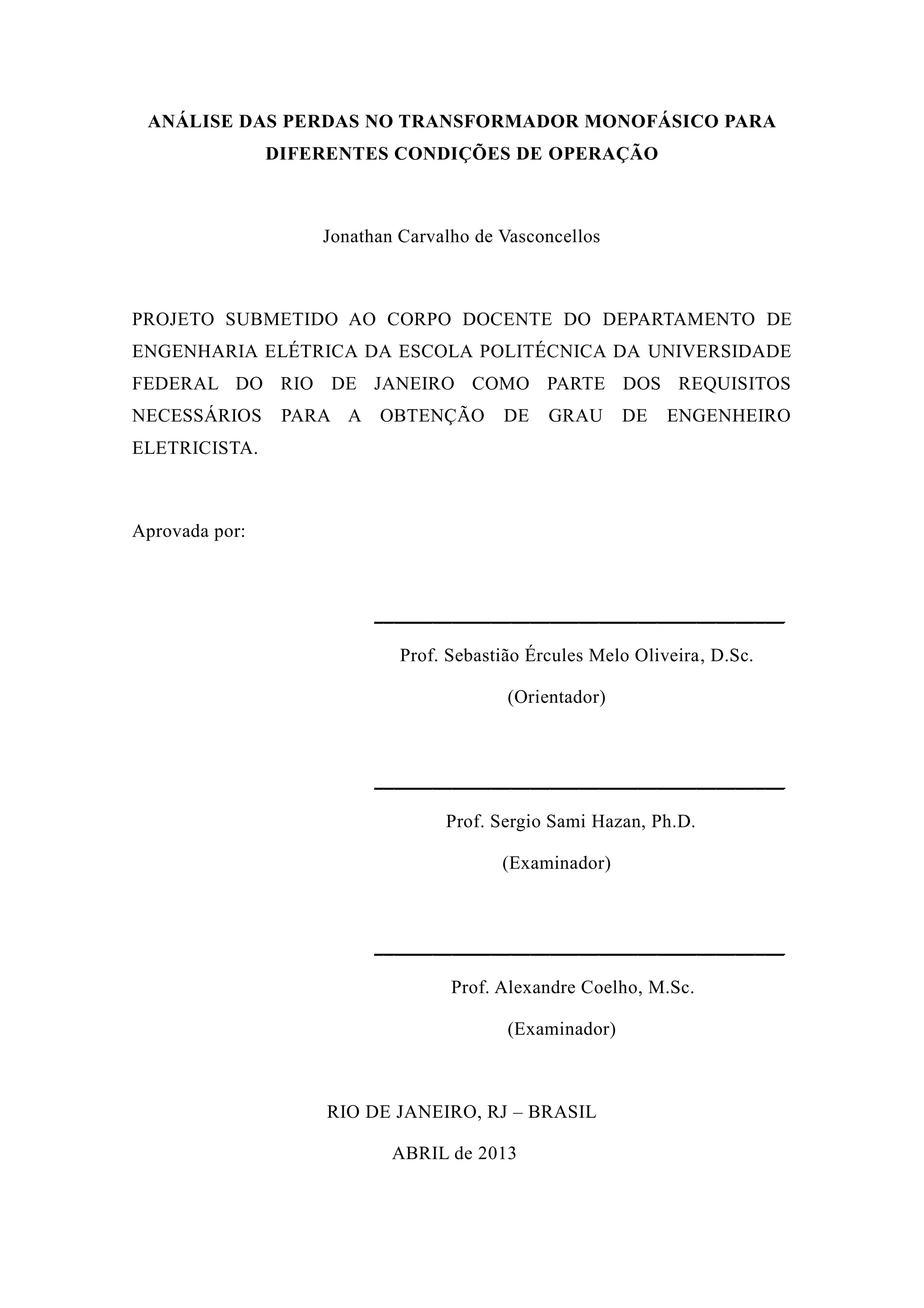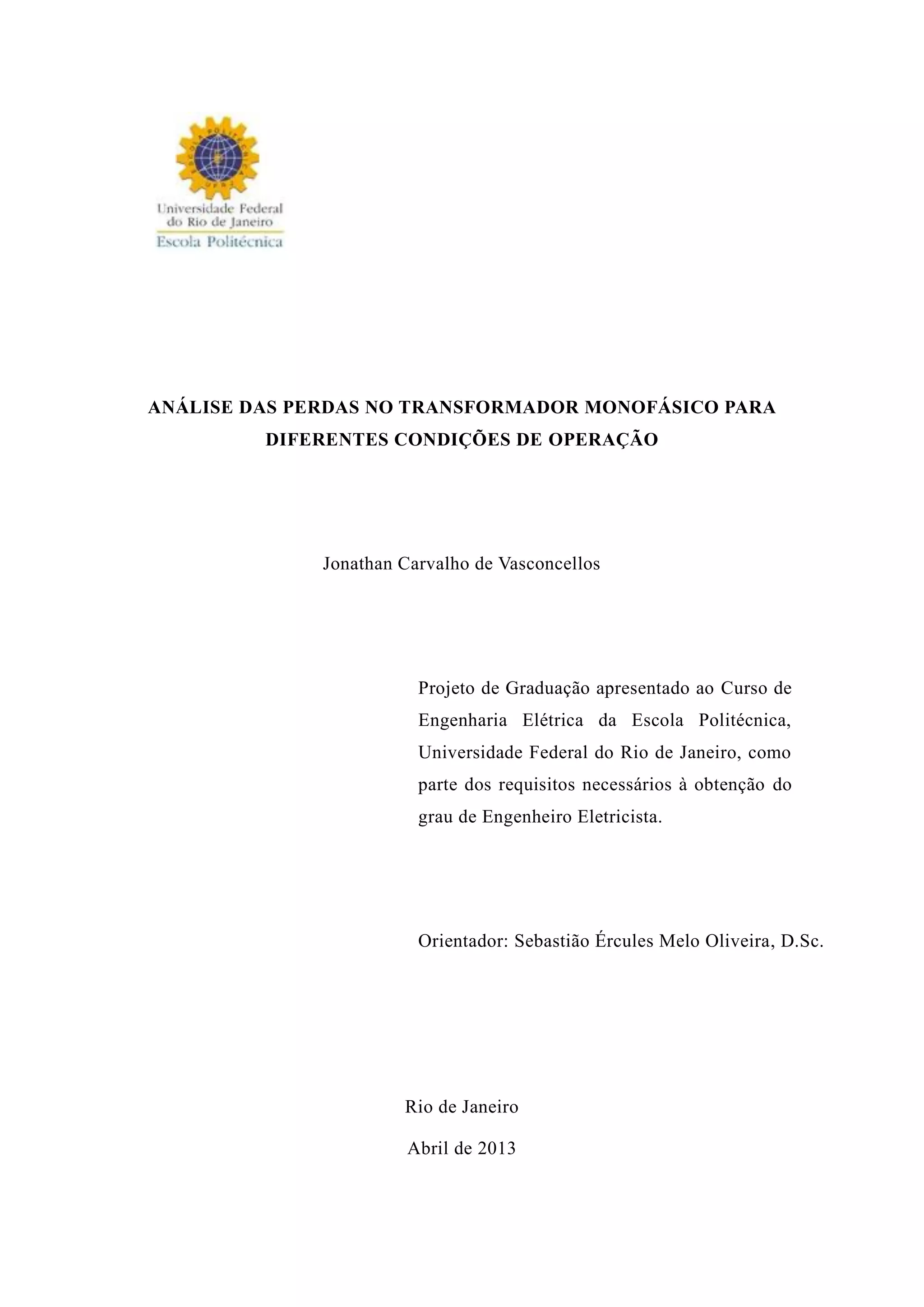 Este documento apresenta um estudo sobre as perdas em um transformador monofásico sob diferentes condições de operação. Foram realizados testes em um transformador de 1 kVA para medir as perdas no núcleo e enrolamentos sem carga e com cargas resistiva e indutiva. Os resultados experimentais foram comparados a simulações no Simulink usando o circuito equivalente do transformador.
