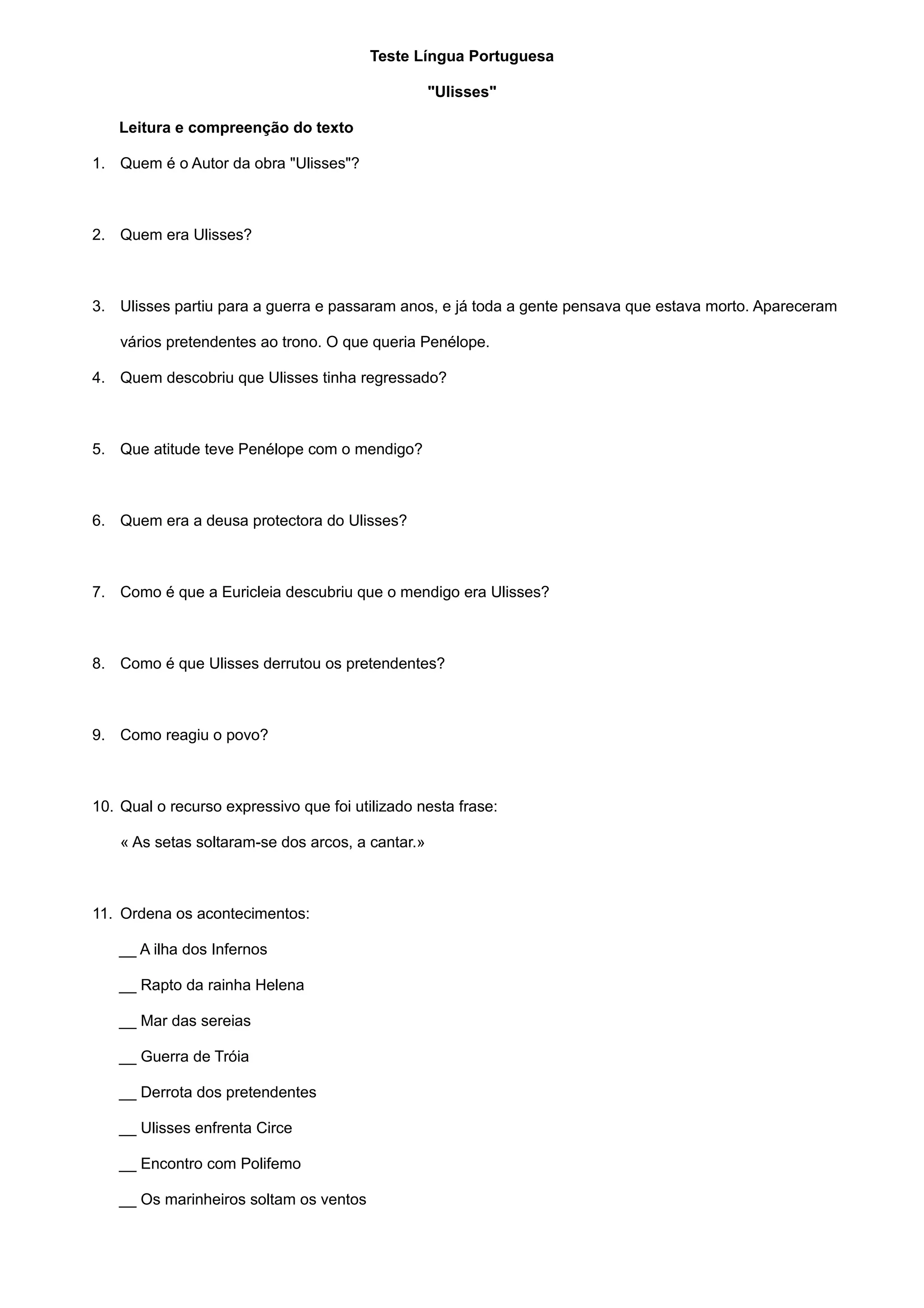O documento contém perguntas sobre a obra "Ulisses" de James Joyce e sobre gramática portuguesa. As perguntas sobre a obra incluem quem era o autor e Ulisses, o que Penélope queria e como Ulisses derrotou os pretendentes. As perguntas gramaticais cobrem temas como verbos, análise morfológica e sintática.