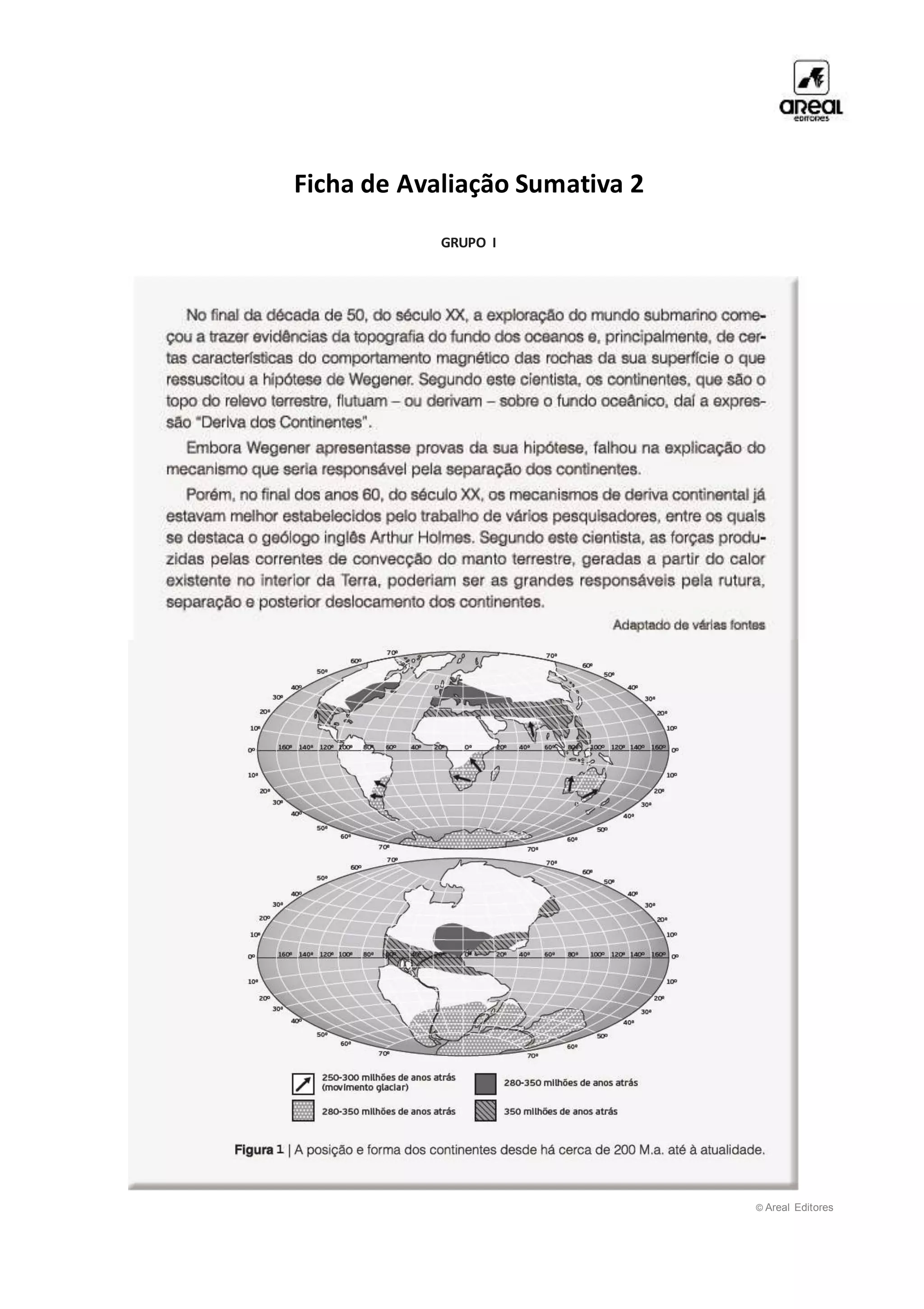 1) O documento contém uma ficha de avaliação sumativa com questões sobre teorias geológicas como a deriva continental de Wegener e a tectónica de placas.