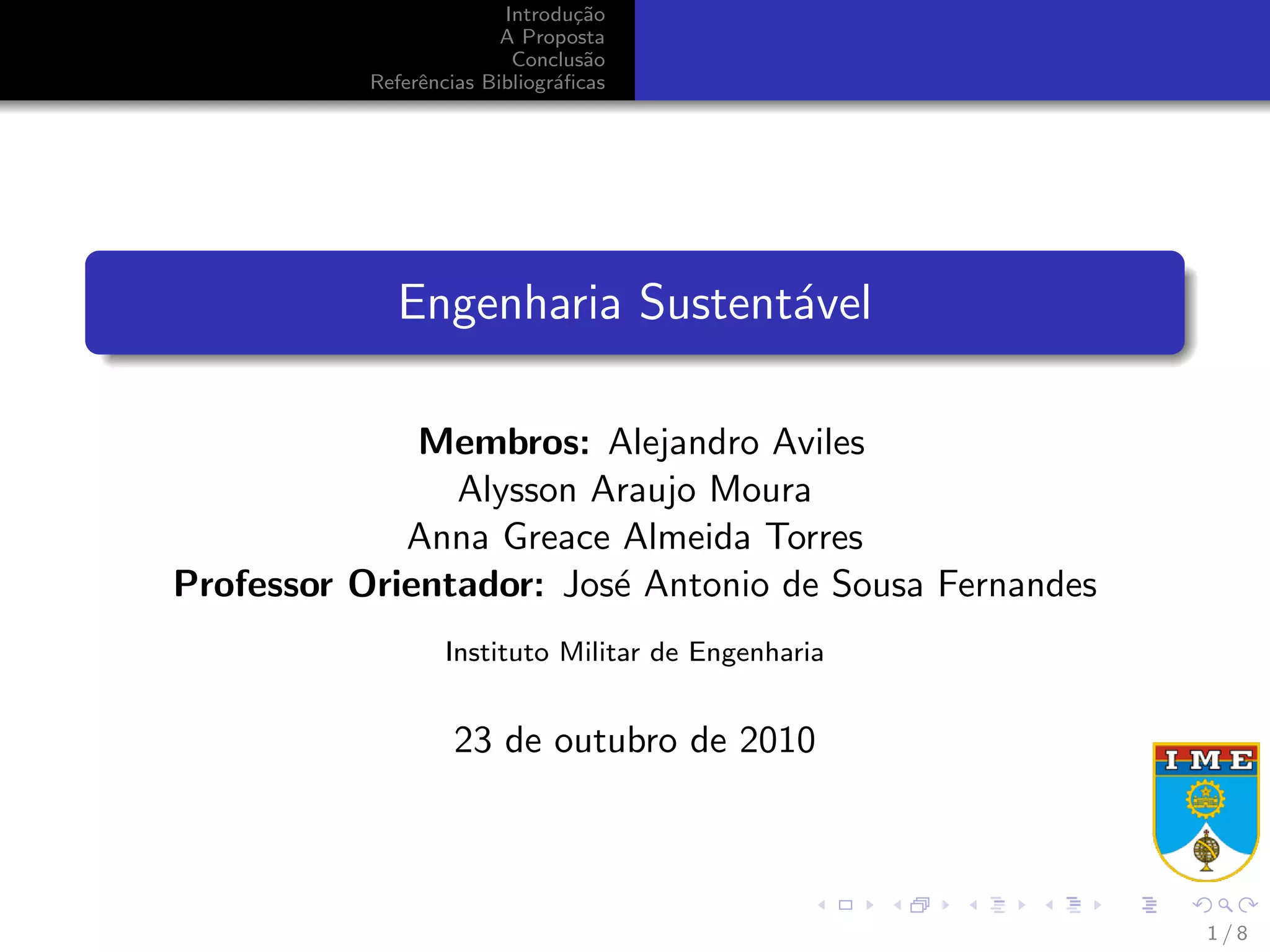 O documento propõe o desenvolvimento sustentável do Instituto Militar de Engenharia através do aproveitamento de recursos naturais como água e energia solar. A proposta inclui métodos para captação e reaproveitamento de água, geração de energia solar e uso de luz solar, além de conscientizar alunos, professores e funcionários sobre sustentabilidade.
