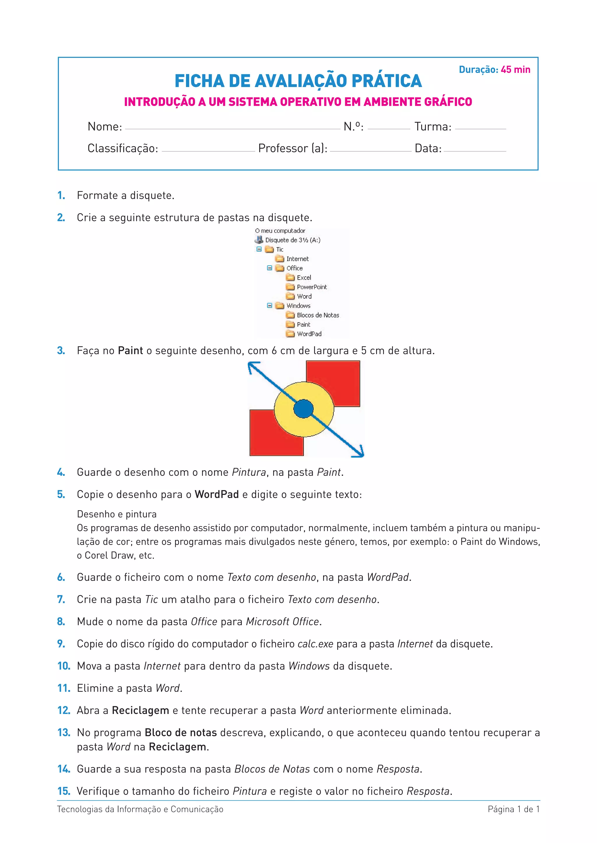 Esta avaliação prática avalia habilidades básicas de sistemas operativos gráficos através de tarefas como formatar disquetes, criar pastas, mover arquivos entre pastas, copiar arquivos, criar atalhos e verificar propriedades de arquivos. Os alunos devem completar 15 tarefas relacionadas e registrar os resultados.