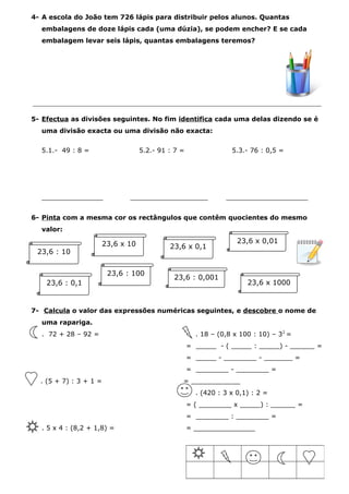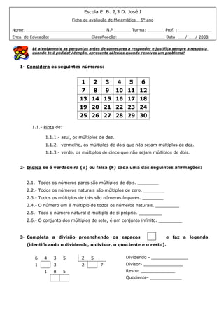 O documento apresenta um conjunto de números divididos em grupos e pede para identificar múltiplos de determinados números e pintá-los de cores específicas. Também contém questões sobre divisores e múltiplos de números naturais, expressões numéricas e problemas envolvendo operações como soma, subtração, multiplicação e divisão.