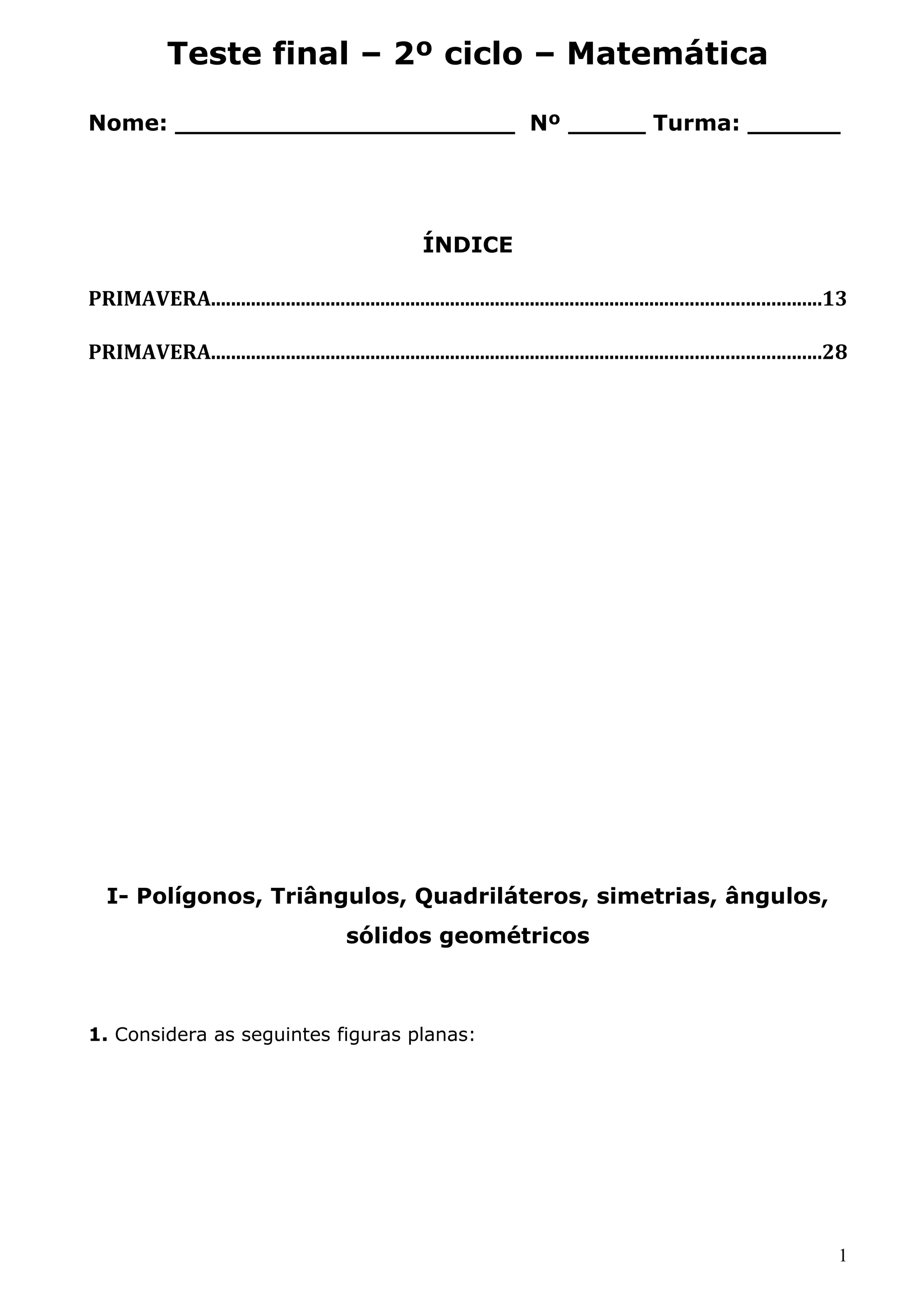 Este documento contém um teste final de Matemática do 2o ciclo com questões sobre geometria plana e espacial, áreas e perímetros, proporcionalidade, estatística, volumes, números inteiros e decimais e fracções. O teste é composto por sete partes e inclui exercícios como classificação de figuras geométricas, cálculo de áreas e perímetros, resolução de problemas de proporcionalidade e percentagens.
