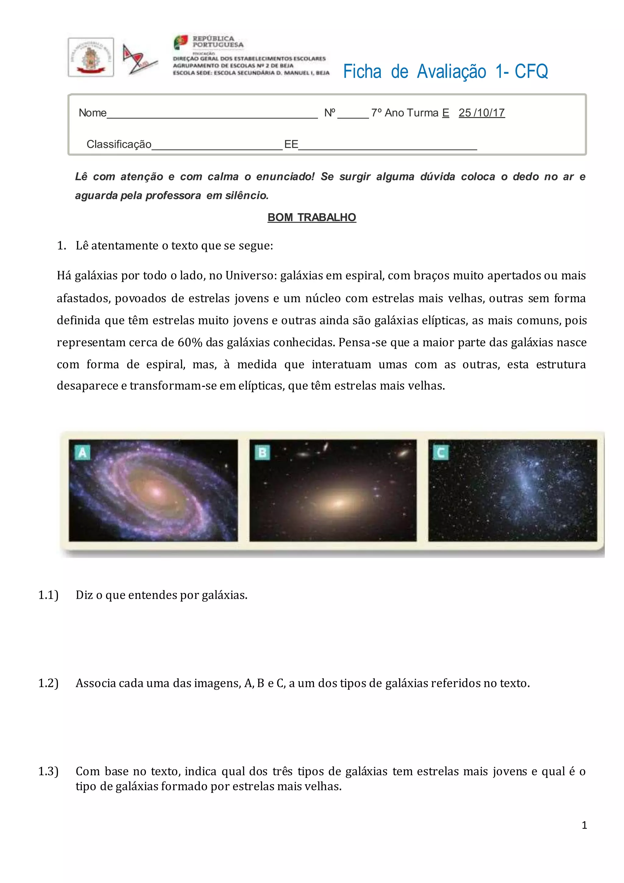 1) O documento discute diferentes tipos de galáxias e corpos celestes no universo, incluindo galáxias em espiral, elípticas e irregulares.