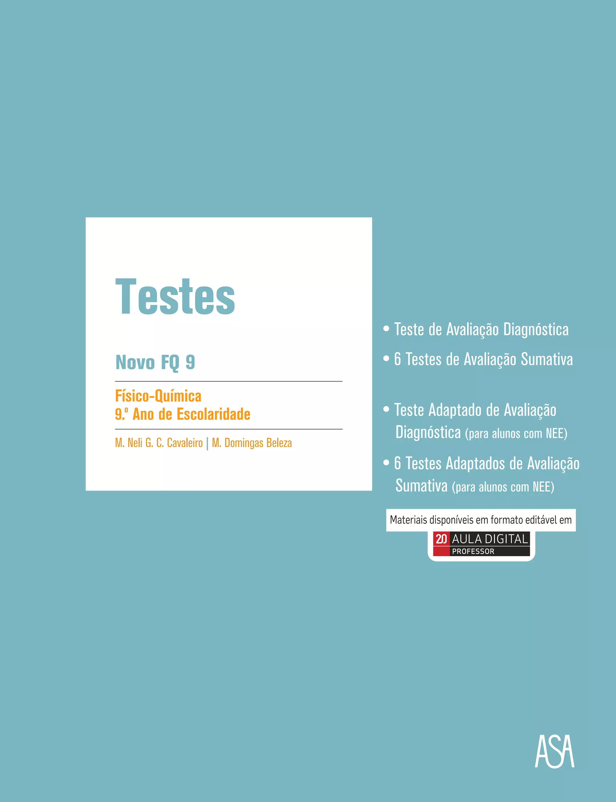 Este documento apresenta propostas de testes de avaliação para o 9o ano de escolaridade em Físico-Química. Inclui um teste de avaliação diagnóstica, seis testes de avaliação sumativa e versões adaptadas destes testes para alunos com Necessidades Educativas Especiais. Fornece também resoluções para os testes.