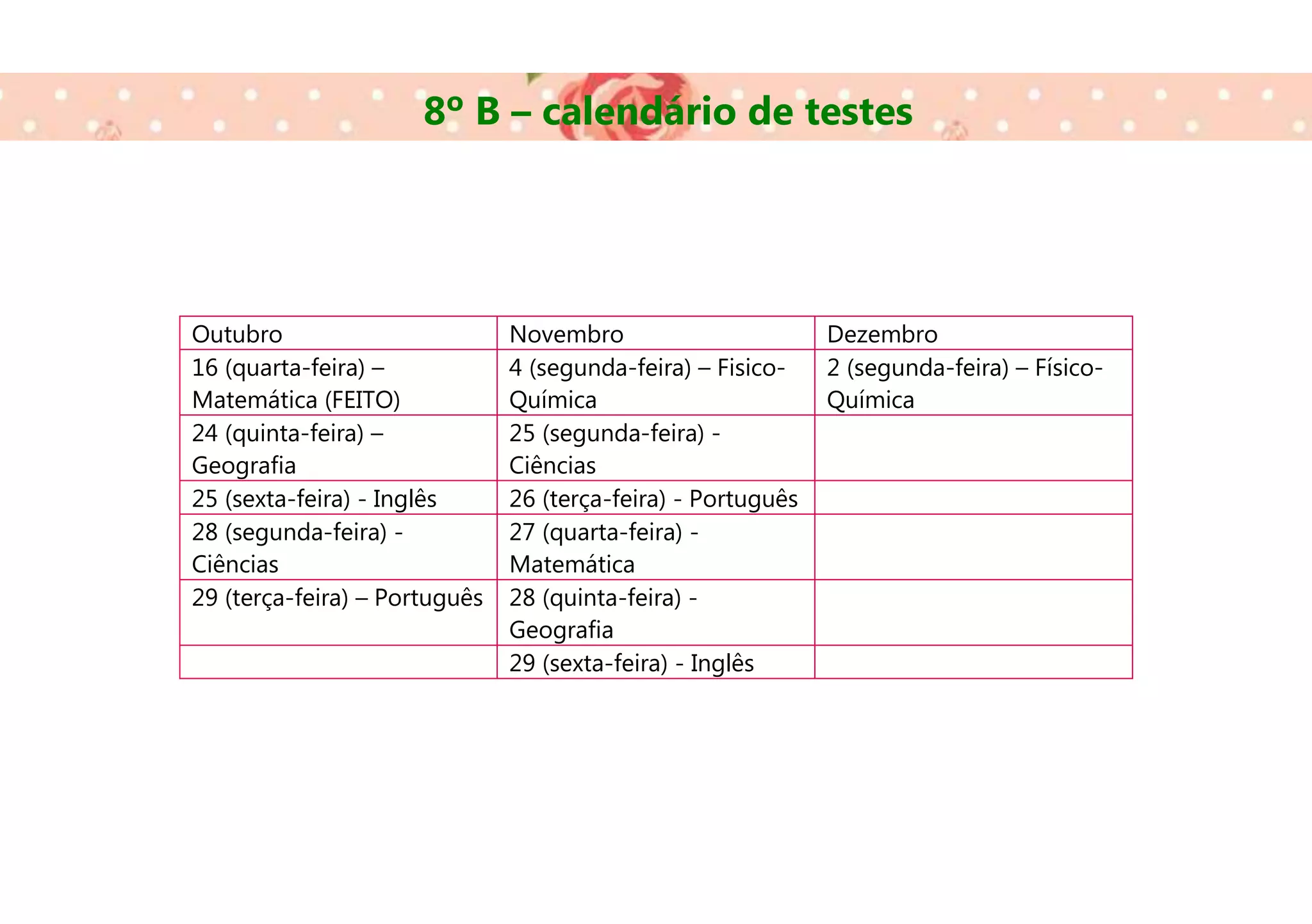 O calendário de testes da turma 8o B inclui provas de diferentes matérias em outubro e novembro, com destaque para testes de matemática, português, geografia, inglês e ciências. Em dezembro há agendado apenas um teste de físico-química.