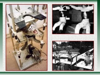 EXPERIMENTOS NA ÁREADA PSICOLOGIA Estudo comportamental, incluindo privação da proteção materna e privação social na inflição de dor, ou seja, afastar os animais da convivência de outros animais, para a observação do medo; no uso de estímulos aversivos, com choque elétricos para aprendizagem; e na indução dos animais a estados psicológicos estressantes, como afastando-se os filhotes recém nascidos de sua mãe, por exemplo. EXPERIMENTOS ARMAMENTISTAS Os animais são submetidos a radiação de armas químicas e biológicas, assim como a descargas de armas tradicionais. São expostos, ainda, a gases e são baleados na cabeça, para estudo da velocidade dos mísseis. PESQUISAS DENTÁRIAS Os animais são forçados a manter uma dieta nociva com açúcares, e hábitos alimentares errôneos para, ao final, adquirirem cáries e terem gengivas descoladas e a arcada dentária removida. PRÁTICAS MÉDICO-CIRÚRGICAS Milhões de animais são submetidos a cirurgias nas faculdades de medicina OS TESTES MAIS COMUNS