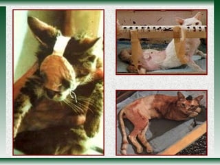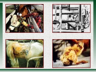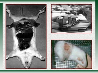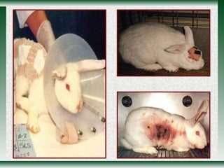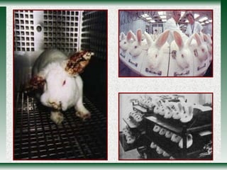 O documento discute vivissecção e testes em animais, apresentando definições, citações e exemplos de testes comuns que causam sofrimento aos animais. Argumenta-se que há métodos alternativos mais éticos e precisos para pesquisas.