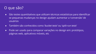 Testes A/B são testes estatísticos que comparam variações de design para identificar qual gera maior conversão de usuários. Eles dividem aleatoriamente os usuários em grupos para testar hipóteses, como colocar um botão de compra em diferentes locais de uma página. Os resultados mostram qual variação teve maior taxa de conversão.