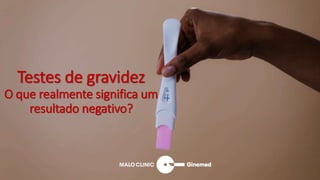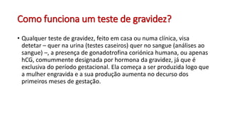 O documento discute testes de gravidez, explicando como funcionam para detectar a hormona hCG e que um resultado negativo não descarta totalmente a possibilidade de gravidez devido a fatores como realizar o teste muito cedo ou usar um teste pouco sensível. Também aborda como garantir resultados mais precisos e explica que resultados falsos-positivos são raros, indicando quase certamente uma gravidez se o teste for positivo.