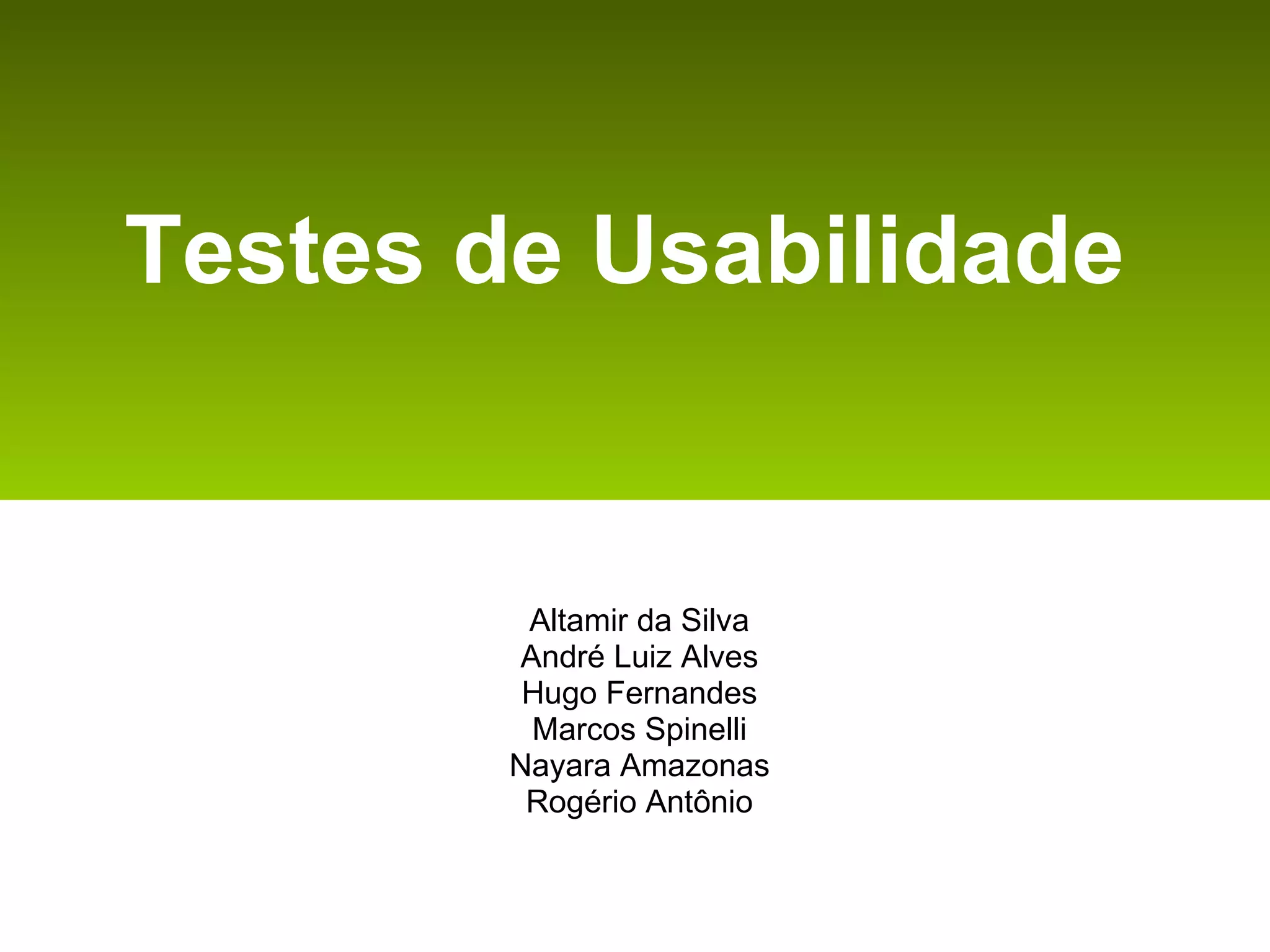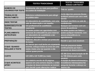 O documento fornece diretrizes sobre testes de usabilidade, incluindo a importância de realizar testes inicialmente e de forma iterativa, testar com usuários leigos em vez de especialistas, e focar nos problemas mais fáceis de corrigir ao examinar os resultados.