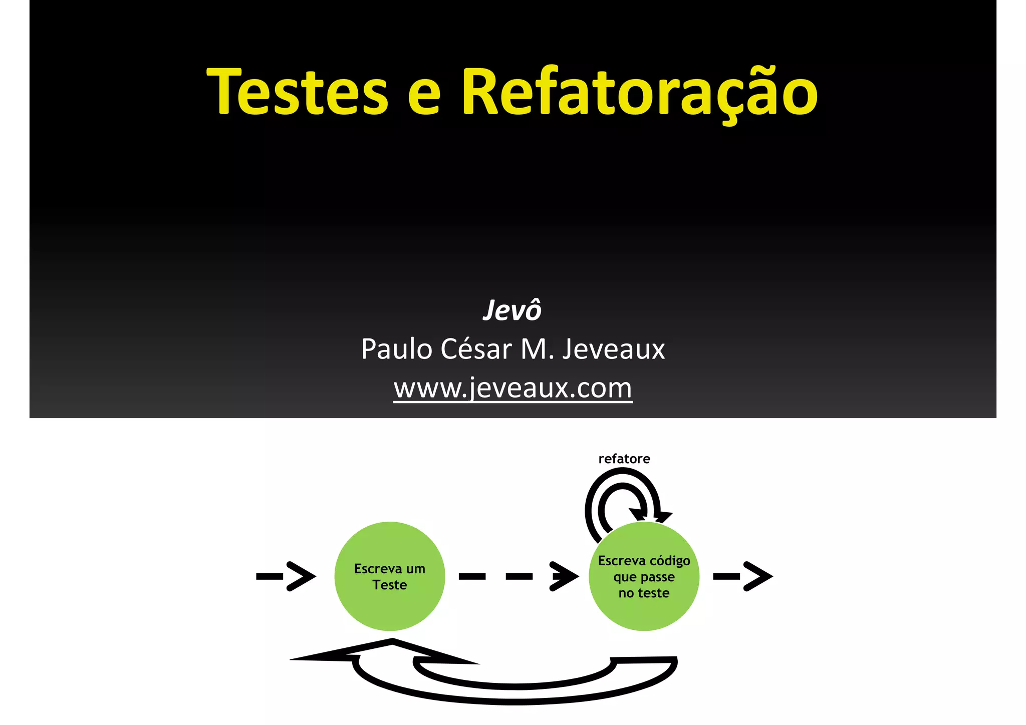 O documento discute a importância dos testes e da refatoração no desenvolvimento de software. É destacado que mais de 1/3 das falhas poderiam ser evitadas com testes e que cerca de 50% das falhas só são descobertas após o software ser lançado. Além disso, falhas em software custam bilhões de dólares à economia global a cada ano. O documento também explica o que são bugs, diferentes tipos de testes como testes unitários e de caixa-preta e a importância da cobertura de testes.