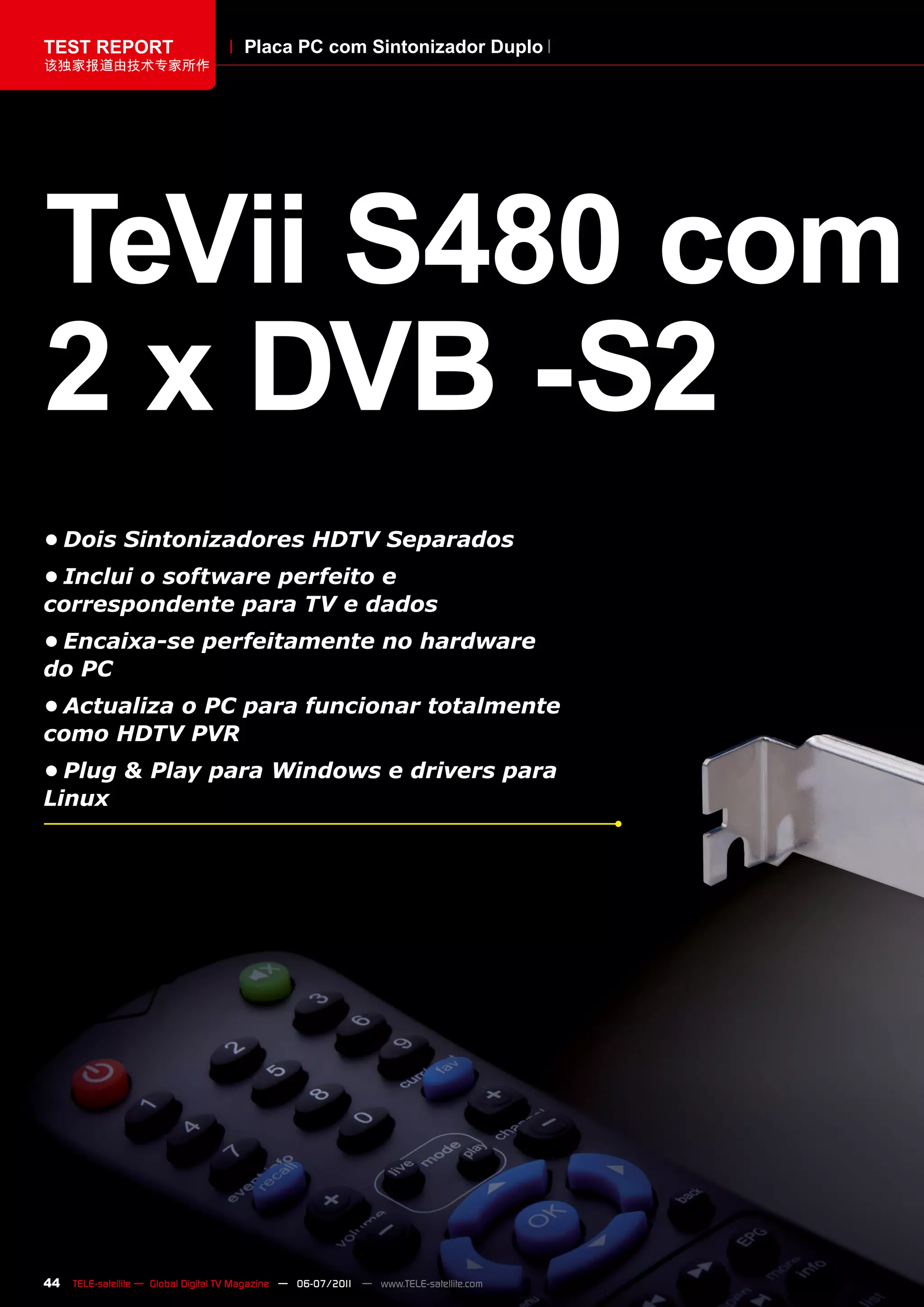 Este relatório testa uma placa de TV para PC com dois sintonizadores DVB-S2. Fornece recepção HDTV independente em dois canais e é fácil de instalar, reconhecendo automaticamente os sinais de satélite. Os sintonizadores funcionam com pouca energia e fornecem recepção confiável mesmo de sinais fracos.